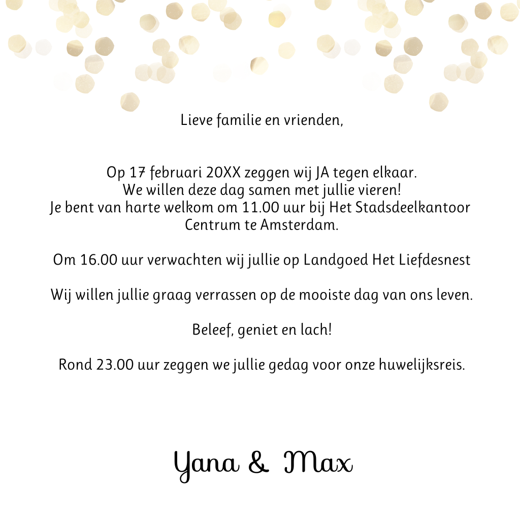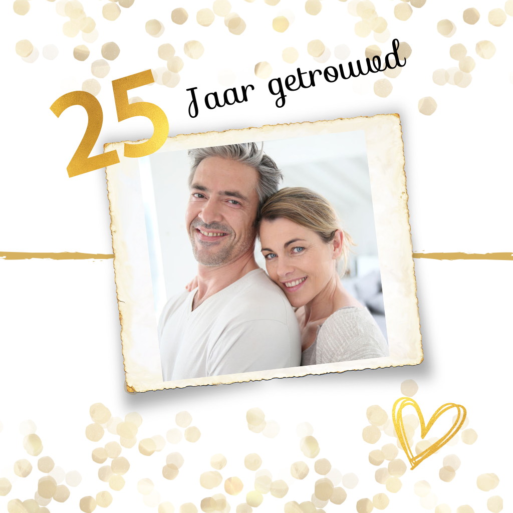 Mooie kaart voor een 25 jarig huwelijk met goudkleurige confetti, hartjes en natuurlijk met jouw eigen foto.