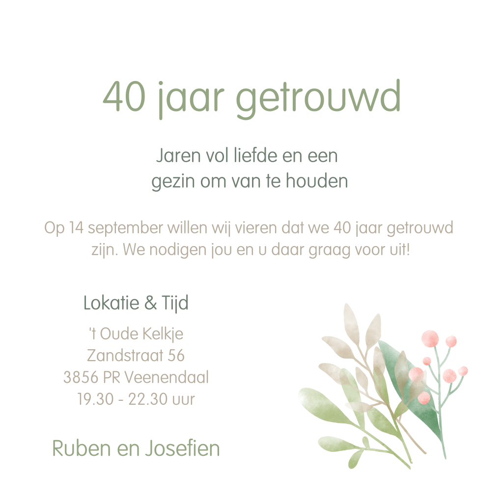 40 jaar getrouwd? Het robijnen huwelijk is een feest waard! Met deze frisse, botanische jubileumuitnodiging met takjes in verschillende tinten groen nodig jij je vrienden en familie uit. Teksten en lettertypes zijn eenvoudig aan te passen. Maak jij hem af?