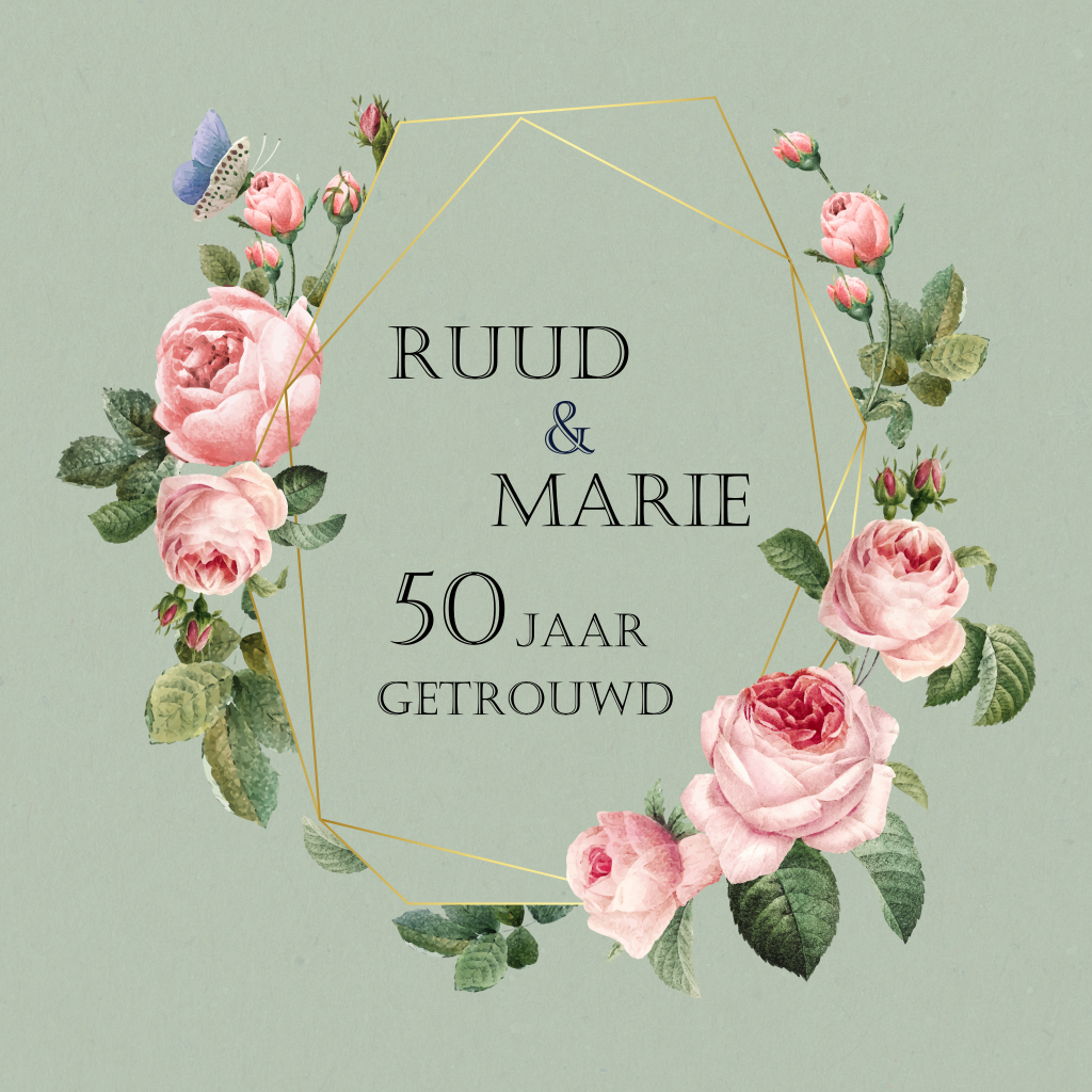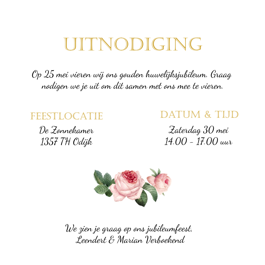 Een stijlvolle jubileumskaart met romantische rozen en een modern, geometrisch design in goudlook. Mooi voor een gouden huwelijk! Kleuren en lettertypes zijn eenvoudig aan te passen in onze online editor. Zo maak je hem helemaal eigen!