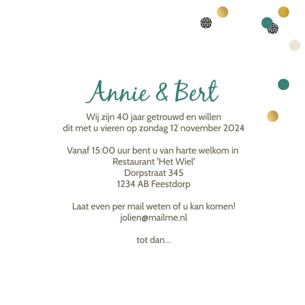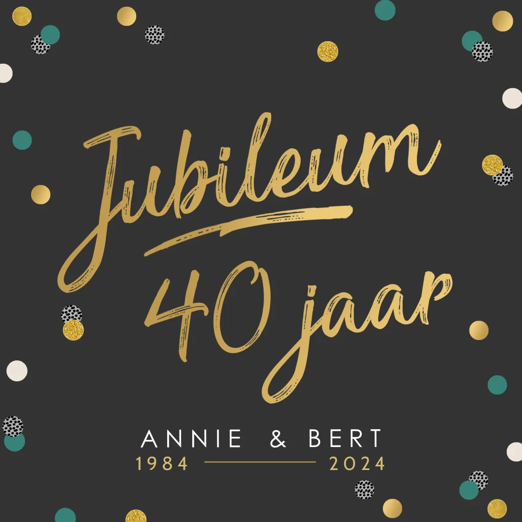 Vrolijke uitnodigingskaart voor een 40 jarig jubileum. Met goudkleurige, groene en witte confetti op een zwarte achtergrond. De teksten op deze kaart pas je eenvoudig aan in de online editor.