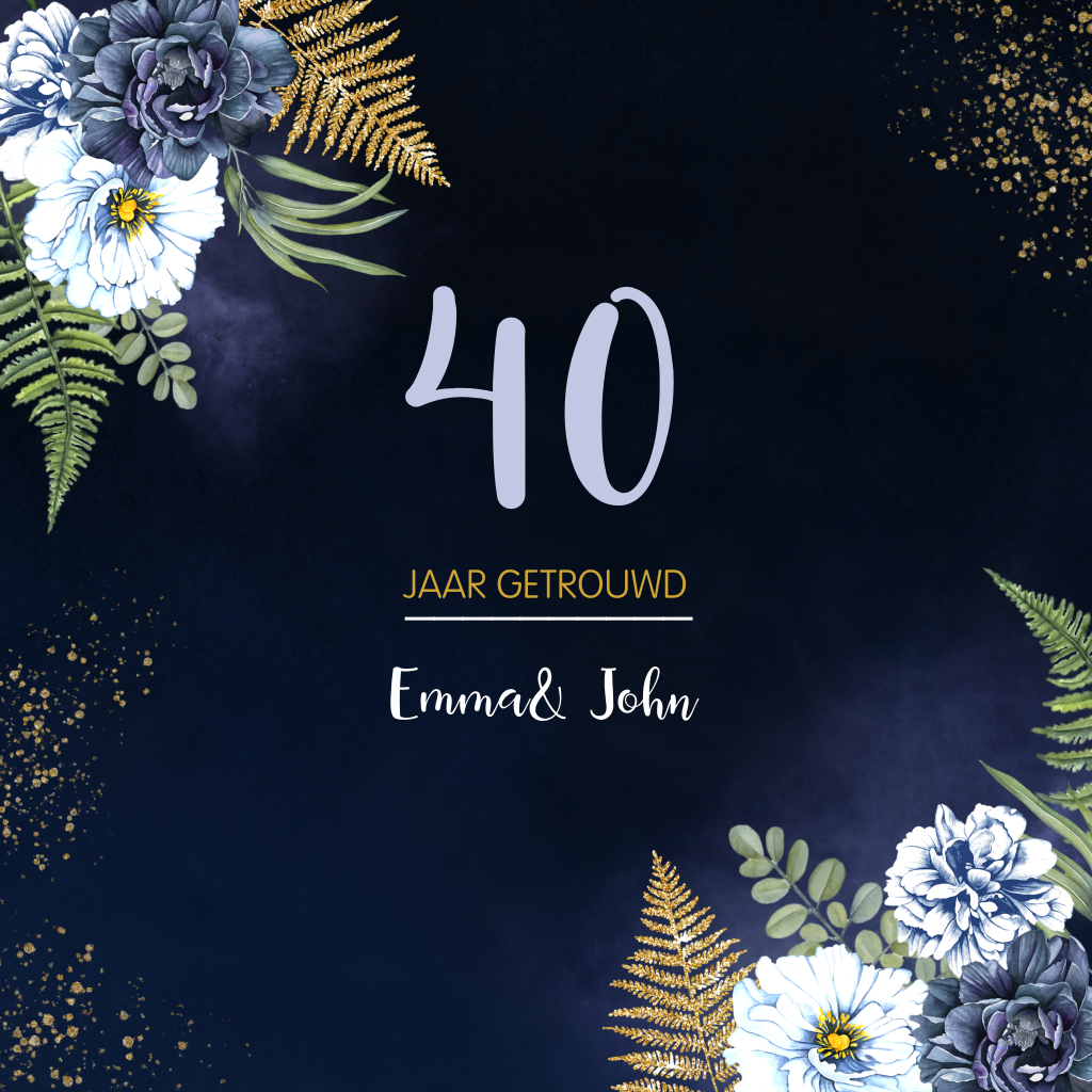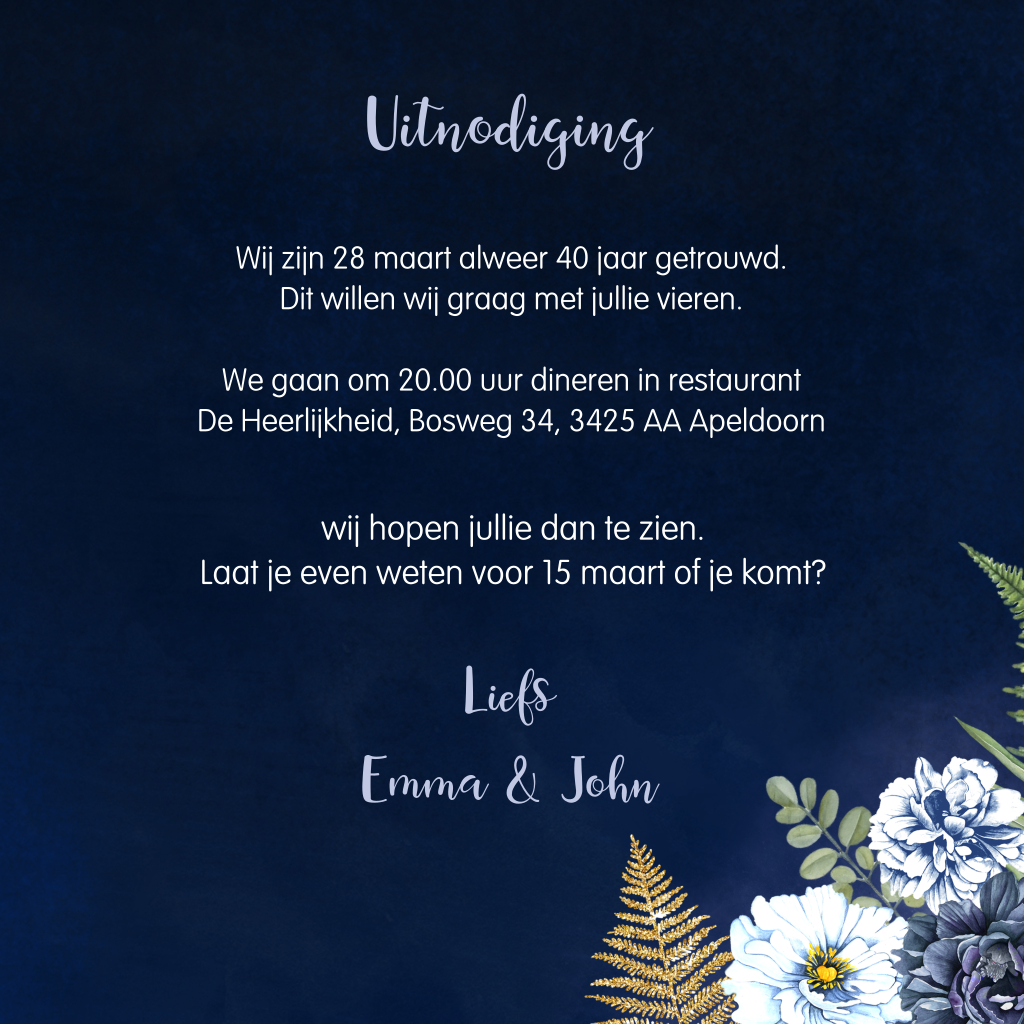 Chique jubileumuitnodiging met blauwe en witte rozen op blauw