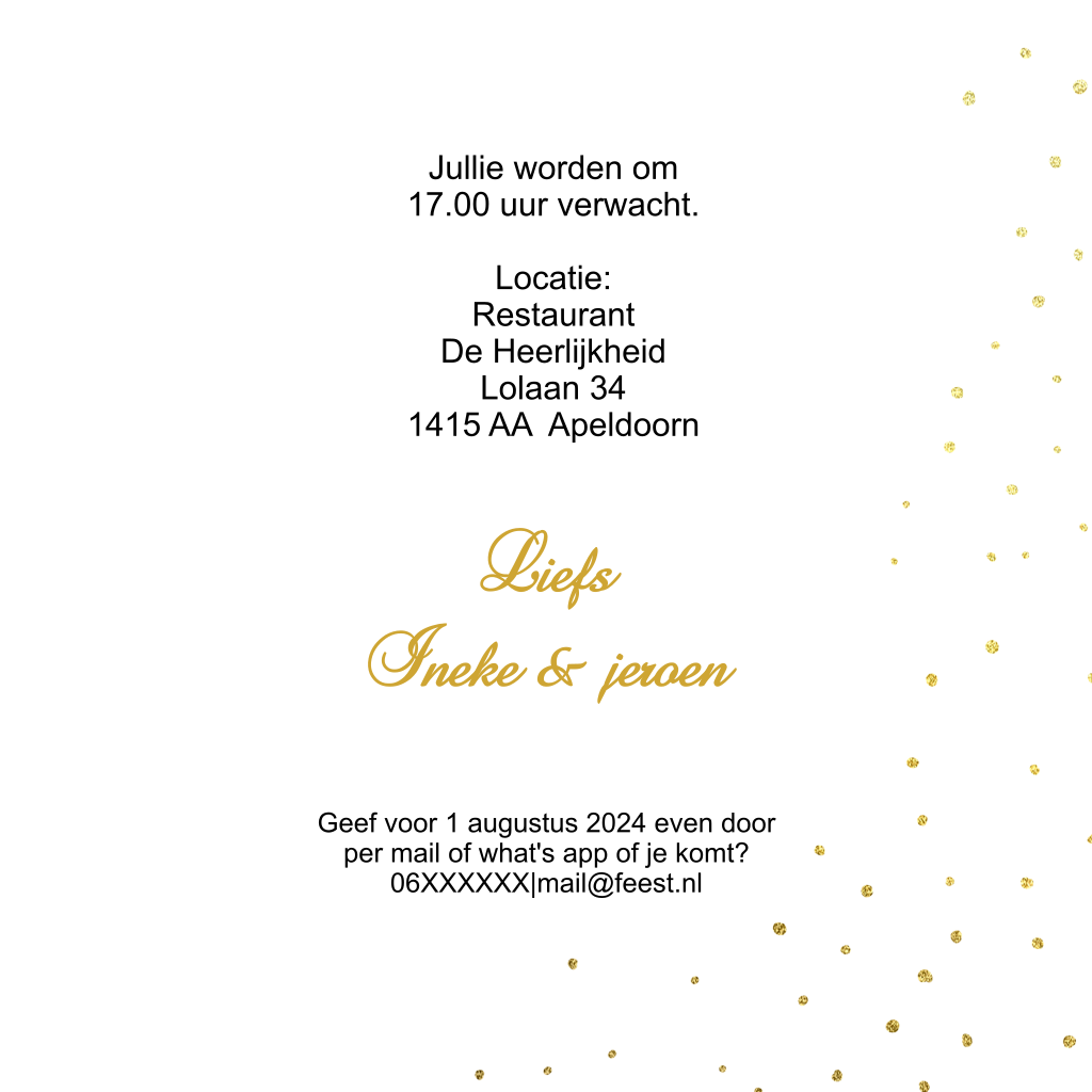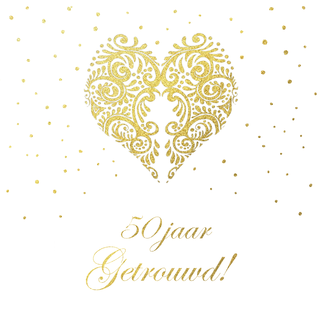 50 jaar getrouwd, hoera! Stuur deze feestelijke uitnodiging met stippen en sierlijk hart in goudlook met glitters naar vrienden en familie. Teksten en lettertypes kun je zelf eenvoudig aanpassen.