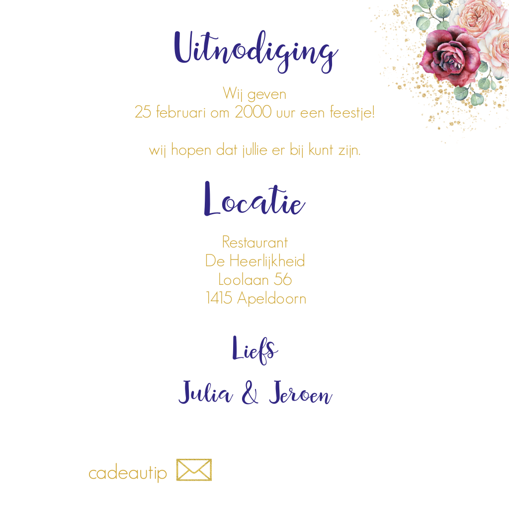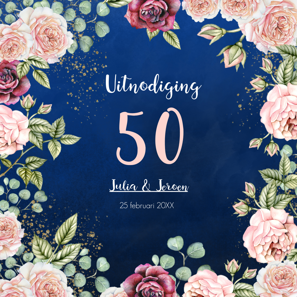 Uitnodigingskaart met mooie rozen op een blauwe achtergrond versierd met glitter. Aan de binnenkant van de kaart kunnen jullie een eigen foto plaatsen.