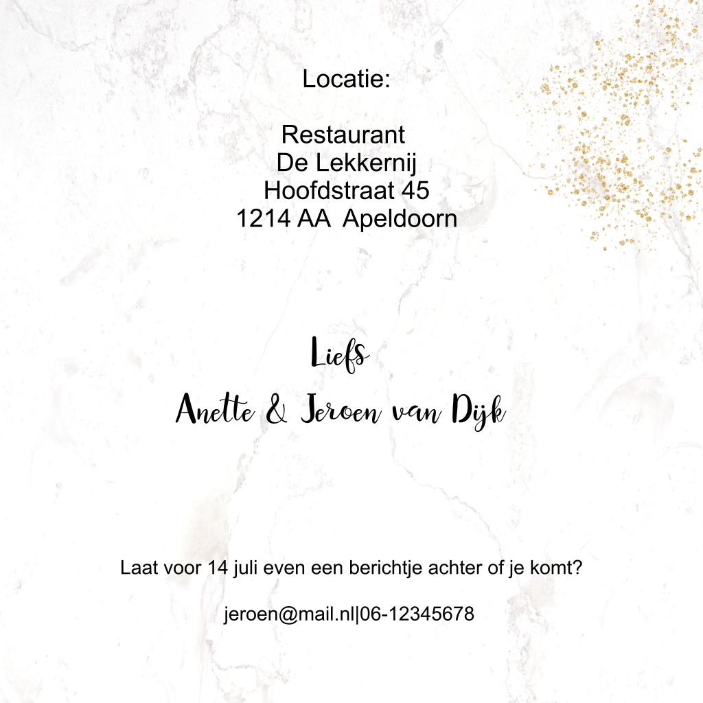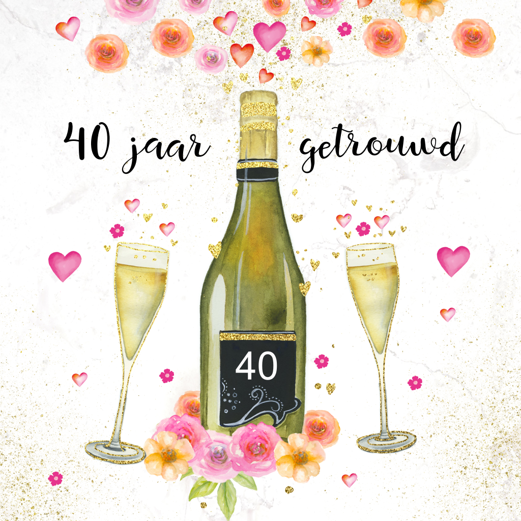 Feestelijke jubileumkaart voor jullie 40e huwelijksjubileum met een fles champagne en twee glazen en bloemetjes op een marmer achtergrond met goudlook glitters.