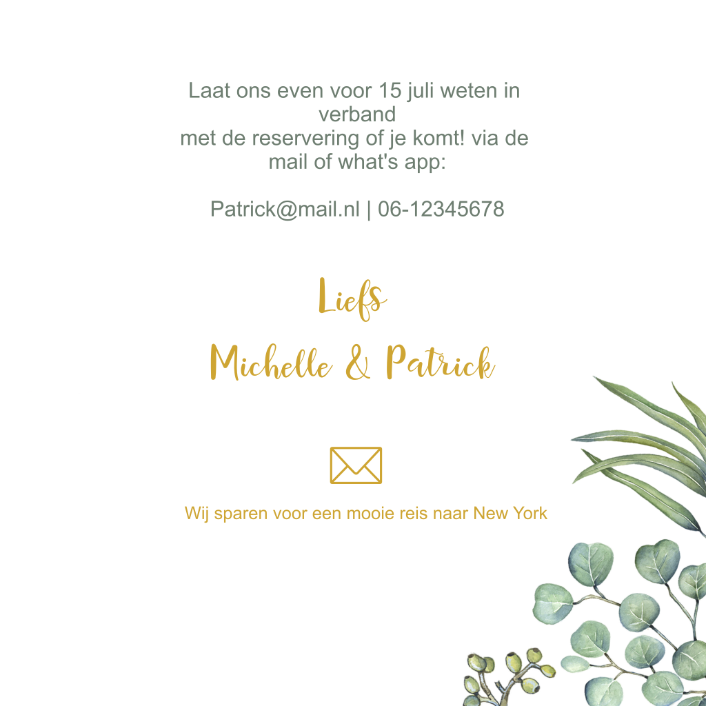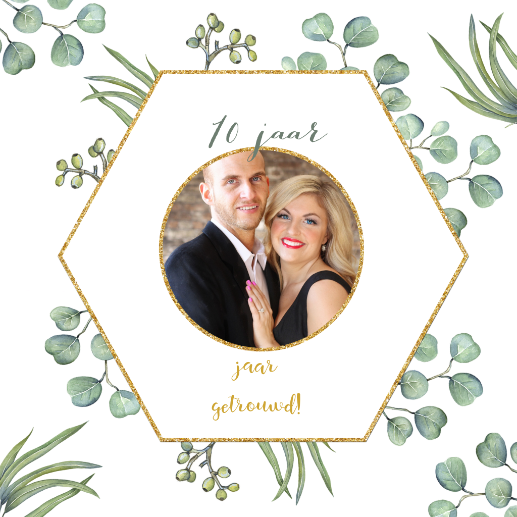 Hippe uitnodiging 10 jarig huwelijksjubileum feest met een groot witte hexagon met op de rand goudlook glitters en in het midden ruimte voor een foto van jullie samen. Op de achtergrond staan illustraties van botanische eucalyptus takjes en bladeren.