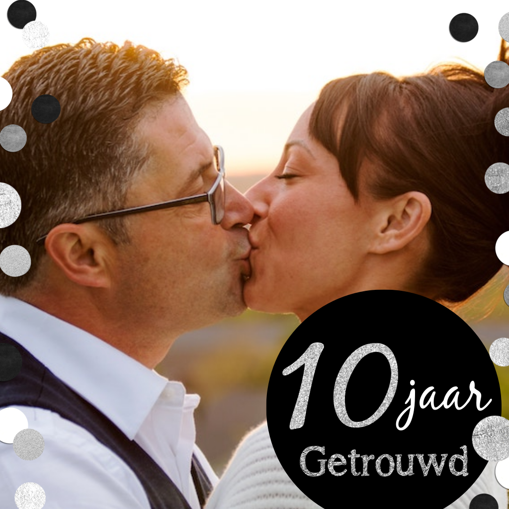 Wie nodig jij uit voor jullie 10-jarig jubileumsfeest? Dit stijlvolle uitnodigingskaartje met stippenconfetti kun je helemaal personaliseren, door een eigen foto toe te voegen en lettertypes en kleuren naar wens aan te passen.