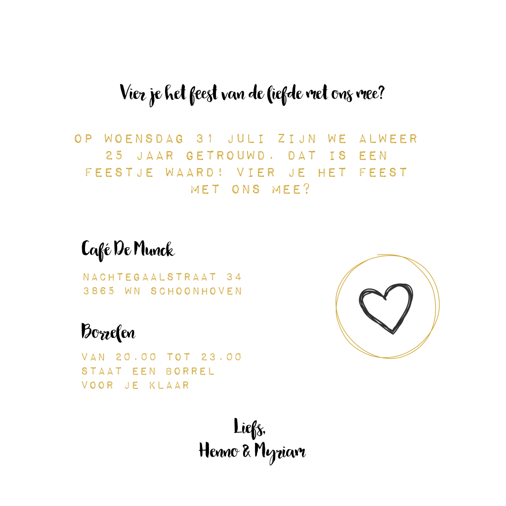 Alweer 25 jaar getrouwd? Tijd voor een feestje! Nodig vrienden en familie uit met deze hippe jubileumkaart met een cirkel omringt door verfspetters en een hartje in goudlook en roze watercolour. Deze kaart is extra leuk met onze goudfolie sluitzegels.