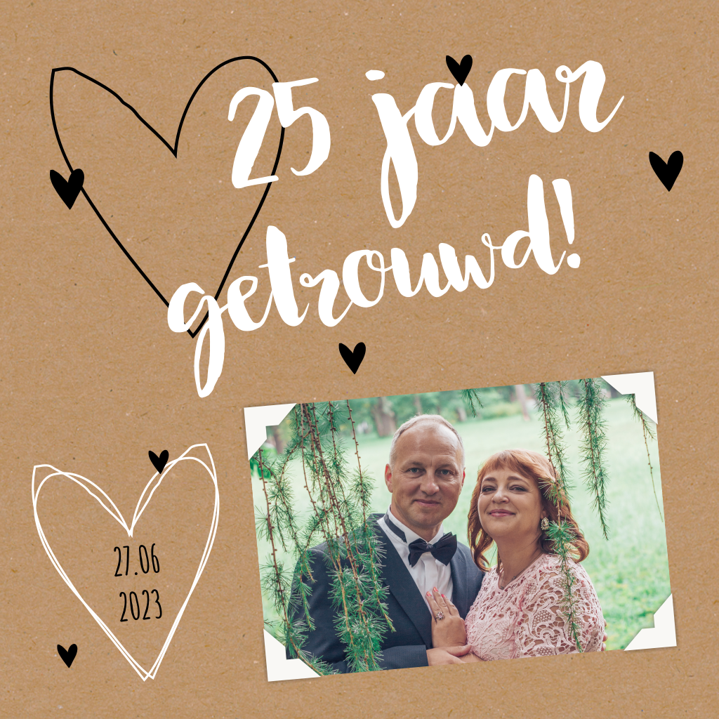 Hippe uitnodiging 25 jarig huwelijk met hartjes en foto op kraft