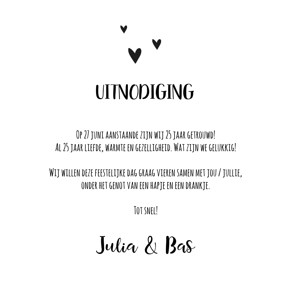 Hip jubileumkaartje voor jullie 25e huwelijksjubileum feest met zwarte getekende hartjes op een stoere kraft papier achtergrond. Plaats op de voorkant een mooie foto van jullie samen en verstuur deze uitnodiging!