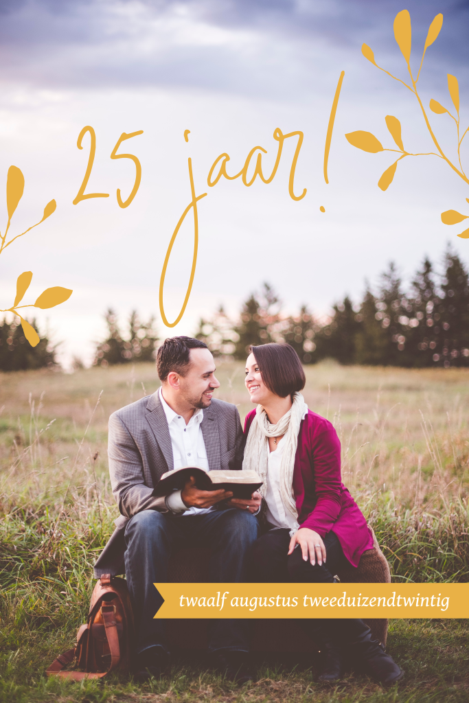 Hippe jubileumkaart voor 25 jarig huwelijk met foto en okergele takjes