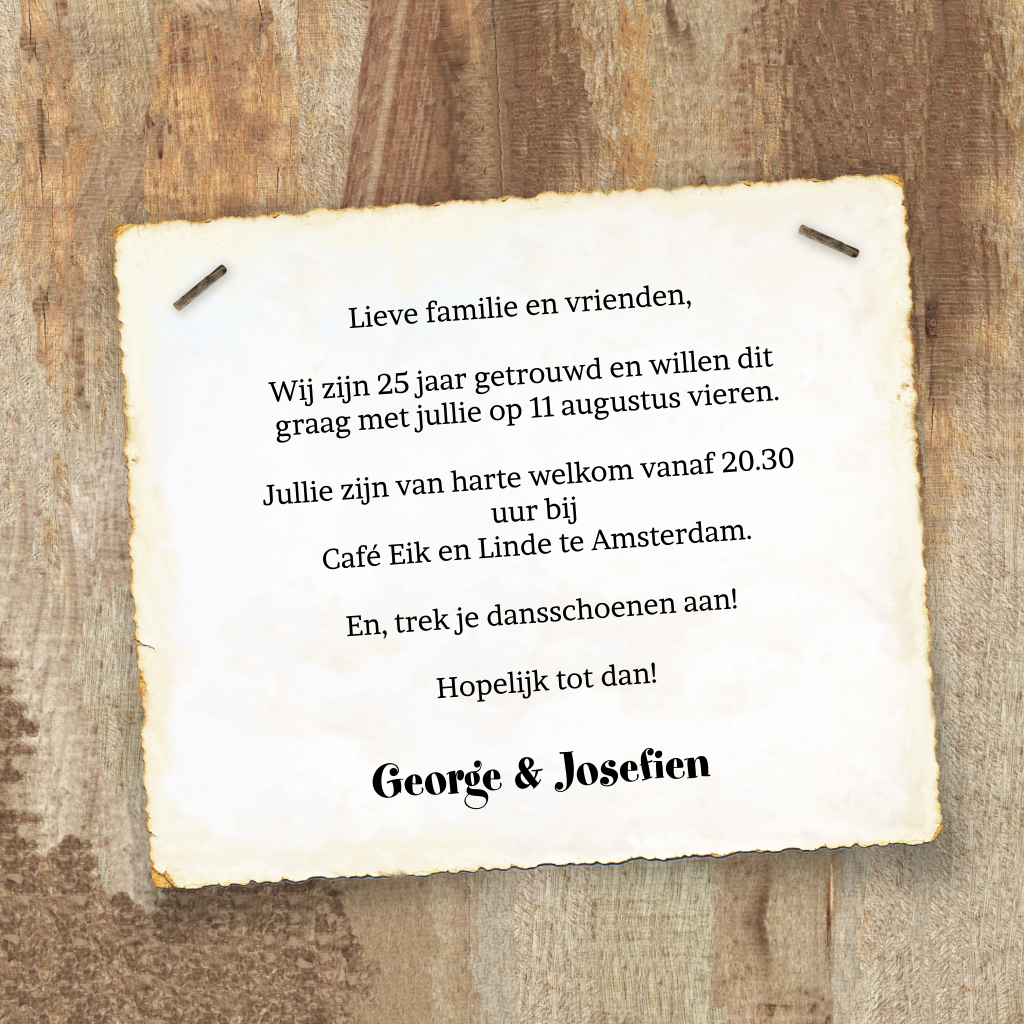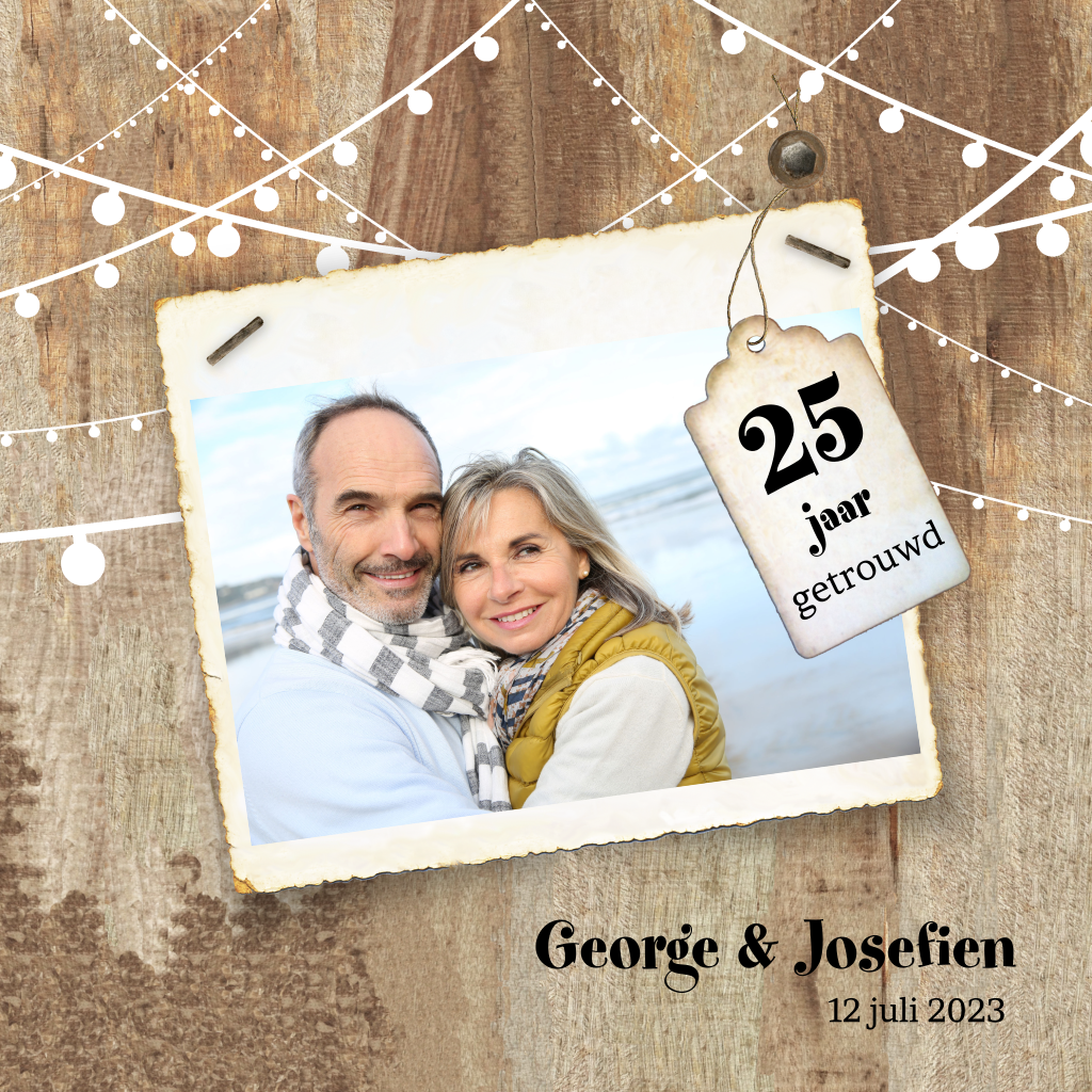 Stijlvolle uitnodiging voor jullie 25 jaar getrouwd jubileumfeest met op een achtergrond van steigerhout feestelijke lampjes slingers, een foto en een label. Schrijf je eigen teksten, plaats je eigen foto en maak een unieke uitnodiging!