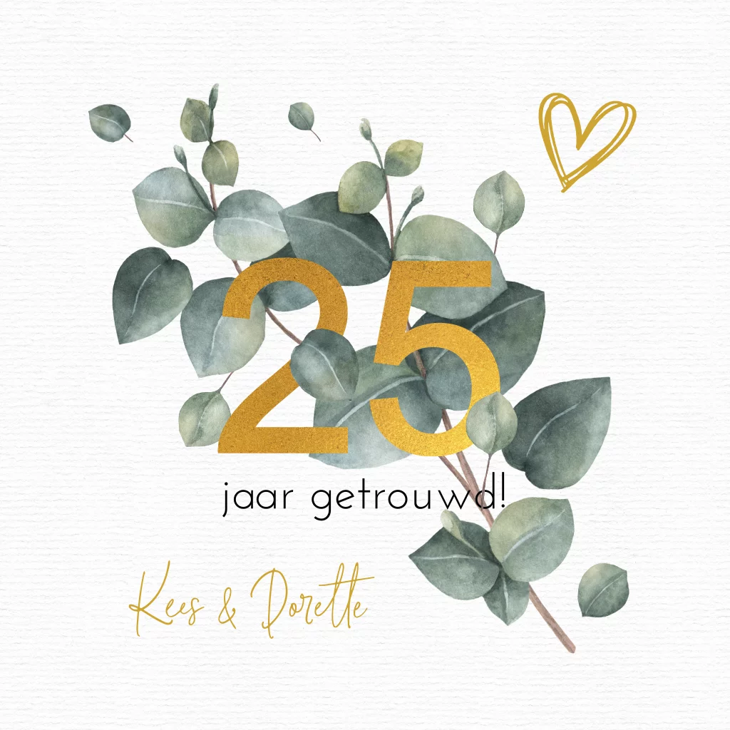 Hippe uitnodiging voor jullie 25 jaar getrouwd huwelijksfeest met eucalyptus takje met daarin een grote "25" in goudlook is dit echt een stijlvol jubileumkaartje!