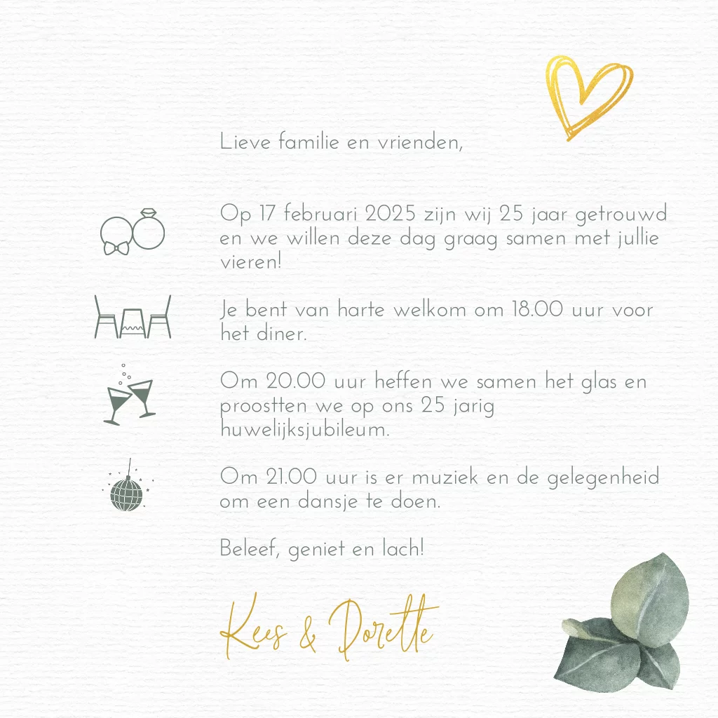 Stijlvolle uitnodiging 25 jarig huwelijk met eucalyptus en hartje