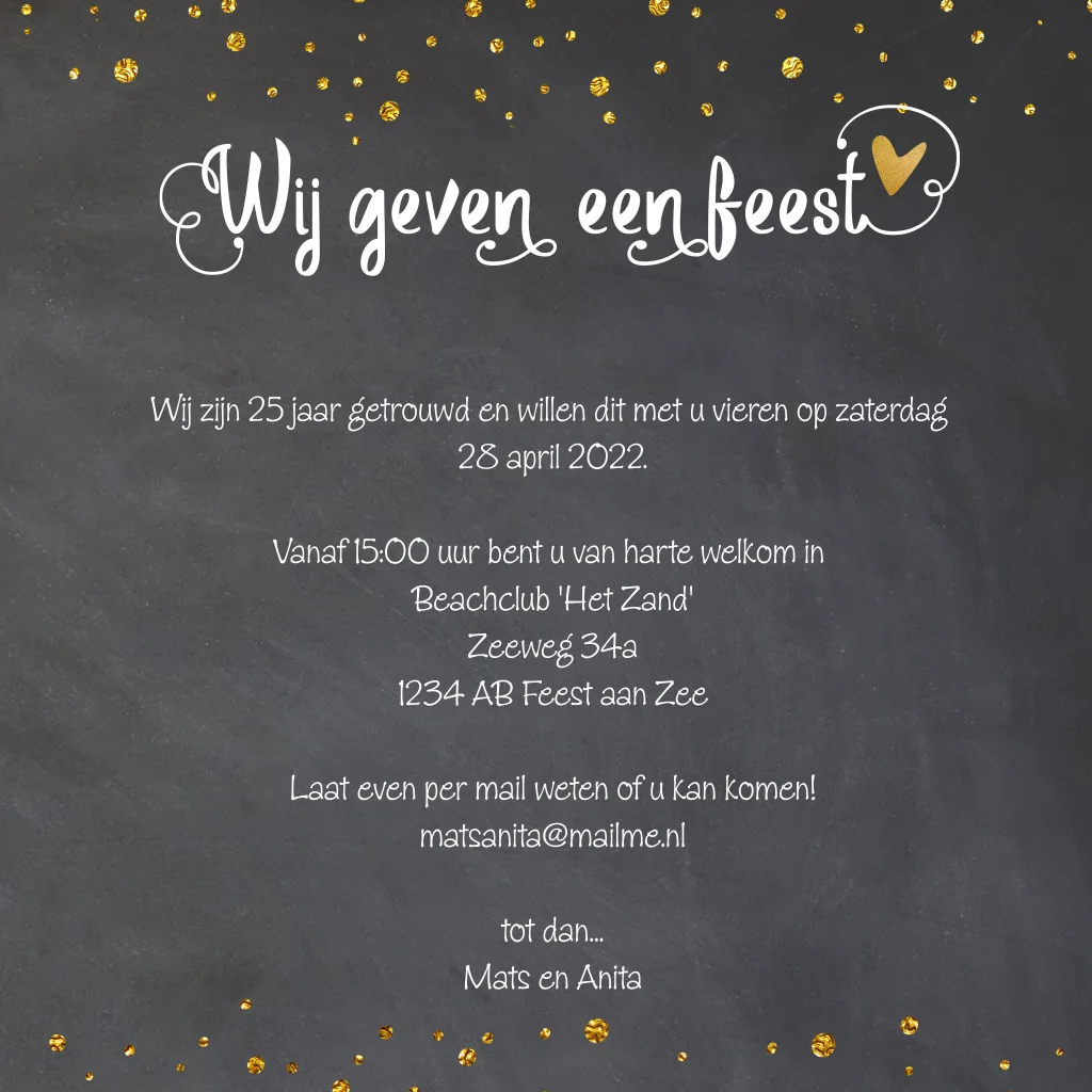 Hippe jubileum uitnodiging voor 25 jaar huwelijk! De gouden hartjes staan op een stoere achtergrond. Pas makkelijk de tekst aan in de editor.