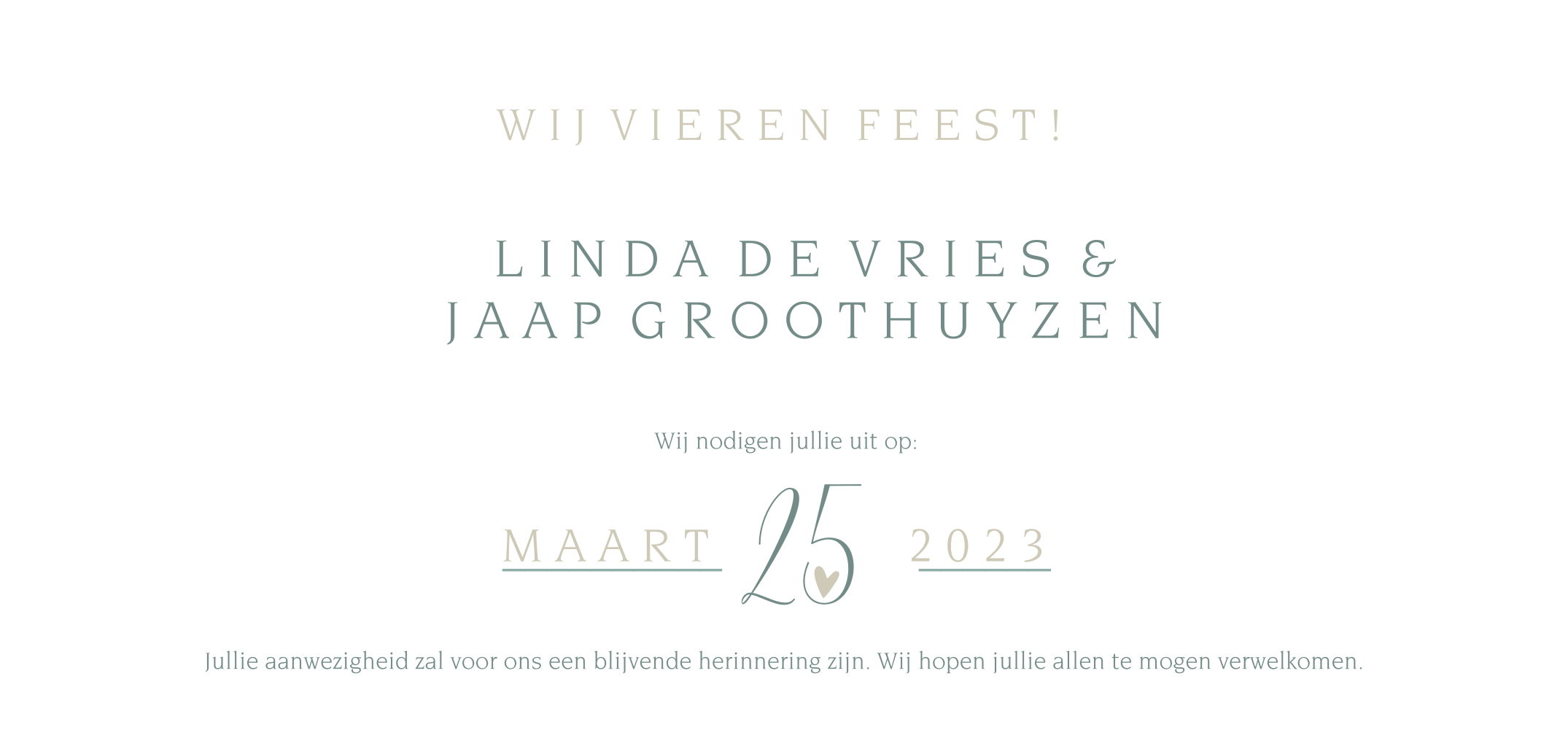 Chique uitnodiging 25 jarig huwelijk met typografie en takjes
