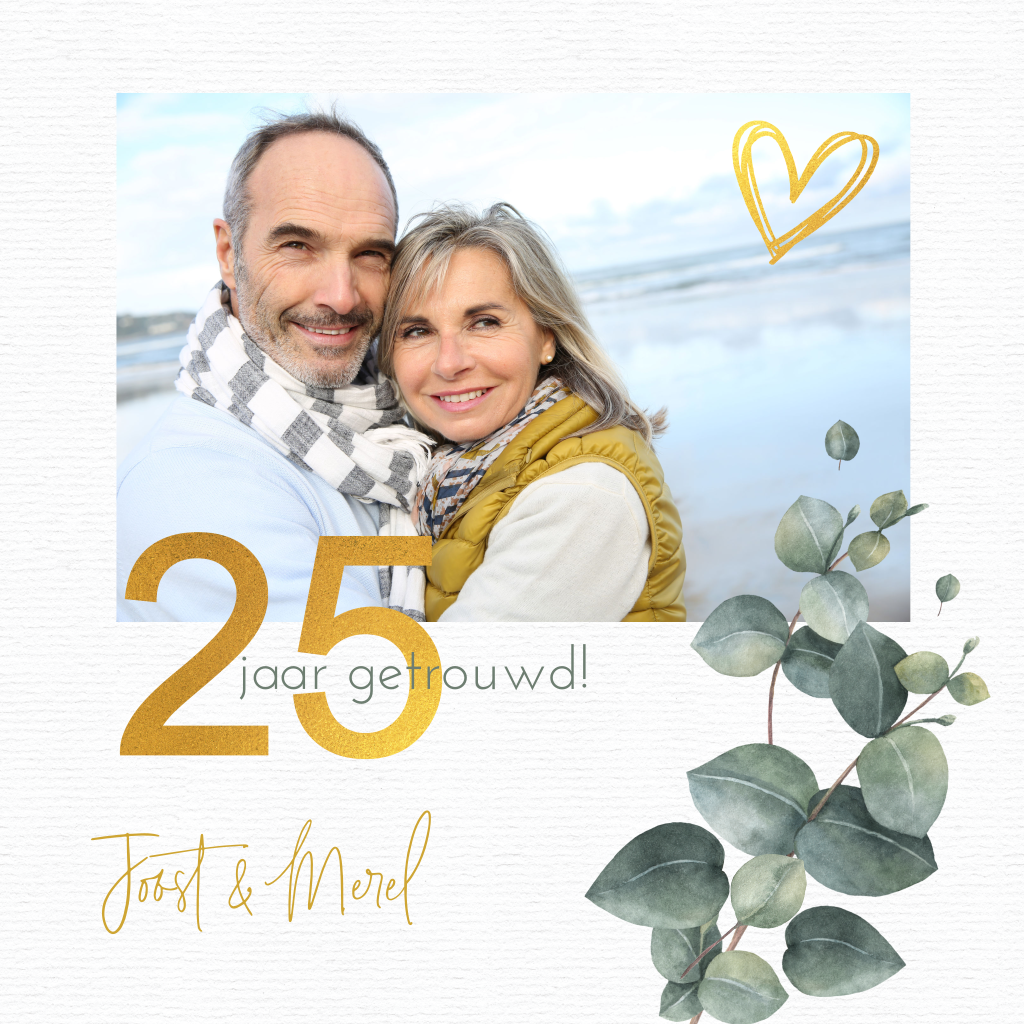 Stijlvolle uitnodiging 25 jarig huwelijk met eucalyptus tak en foto