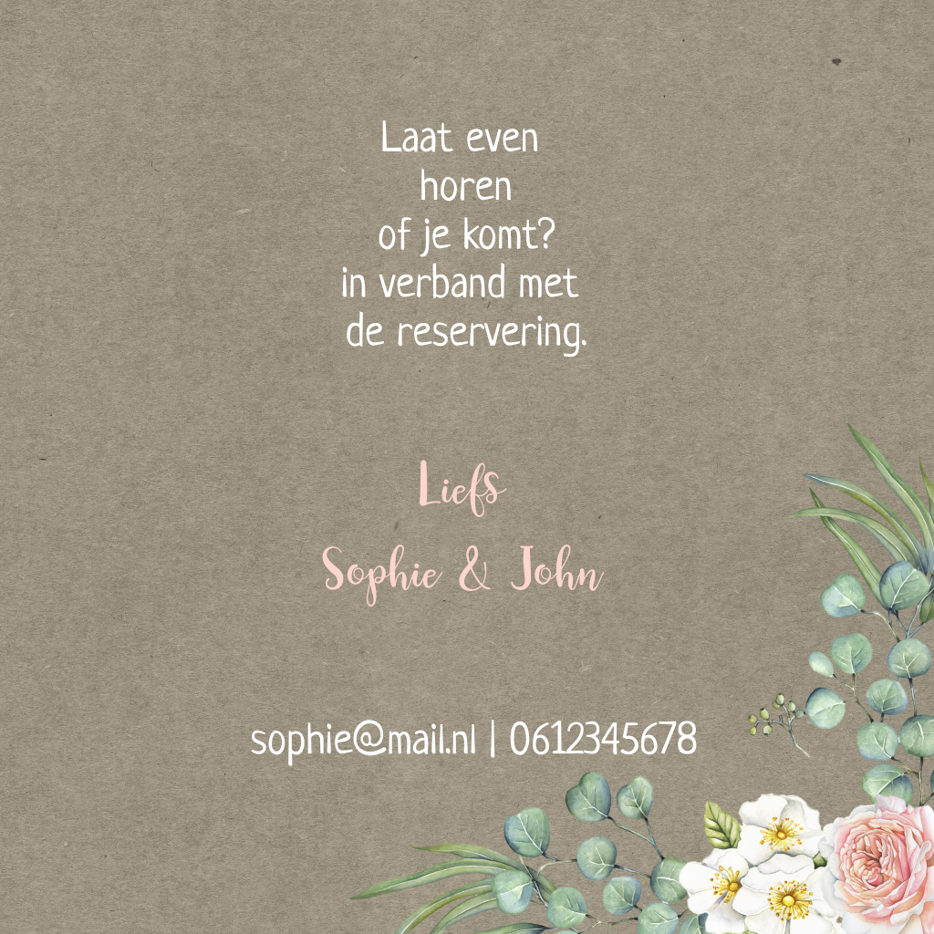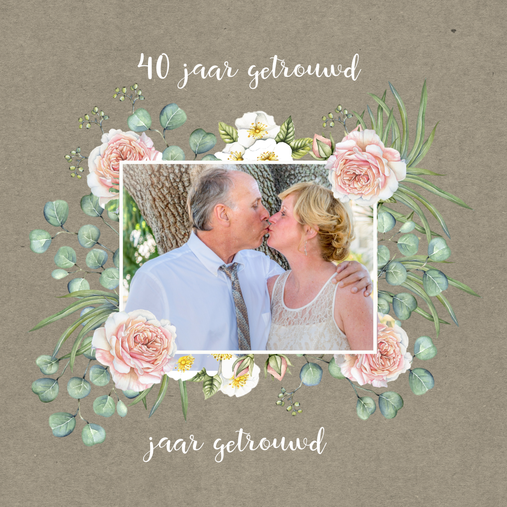 Stijlvolle uitnodiging voor jullie 40 jaar getrouwd jubileumfeest met een foto in een botanische kader van eucalyptus bladeren en rozen op een kraft papier achtergrond.