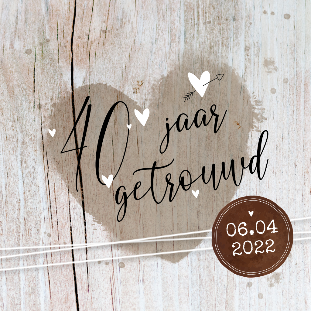Hippe uitnodiging voor jullie 40e huwelijksjubileum met een groot hart op een houten achtergrond en een touwtje met een wax stempel waar de datum van jullie feest in staat.