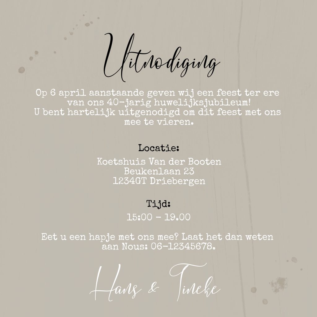 Stoere uitnodiging 40 jarig huwelijk met hart op hout en wax stempel