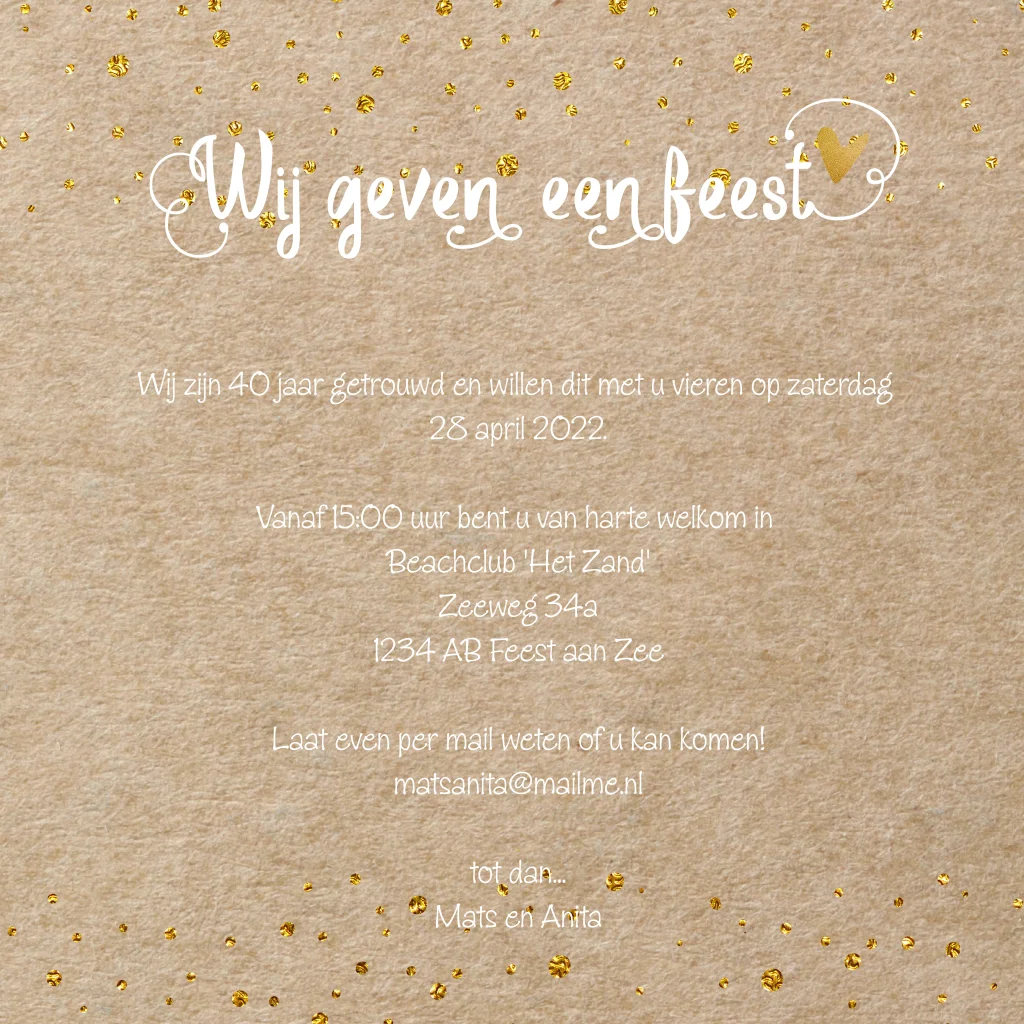 Trendy uitnodigingskaart voor jullie 40 jarig jubileum. Met goudkleurige hartjes en confetti op een kraft look achtergrond. Aan de binnenkant van de kaart is ruimte voor een mooie foto van jullie samen. Pas de teksten gemakkelijk aan in de online editor.