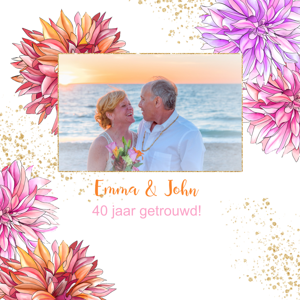 Chique uitnodiging 40 jarig huwelijksfeest met dahlia bloemen in oranje en paars, goudlook glitter verfspetters en ruimte voor een foto van jullie samen.