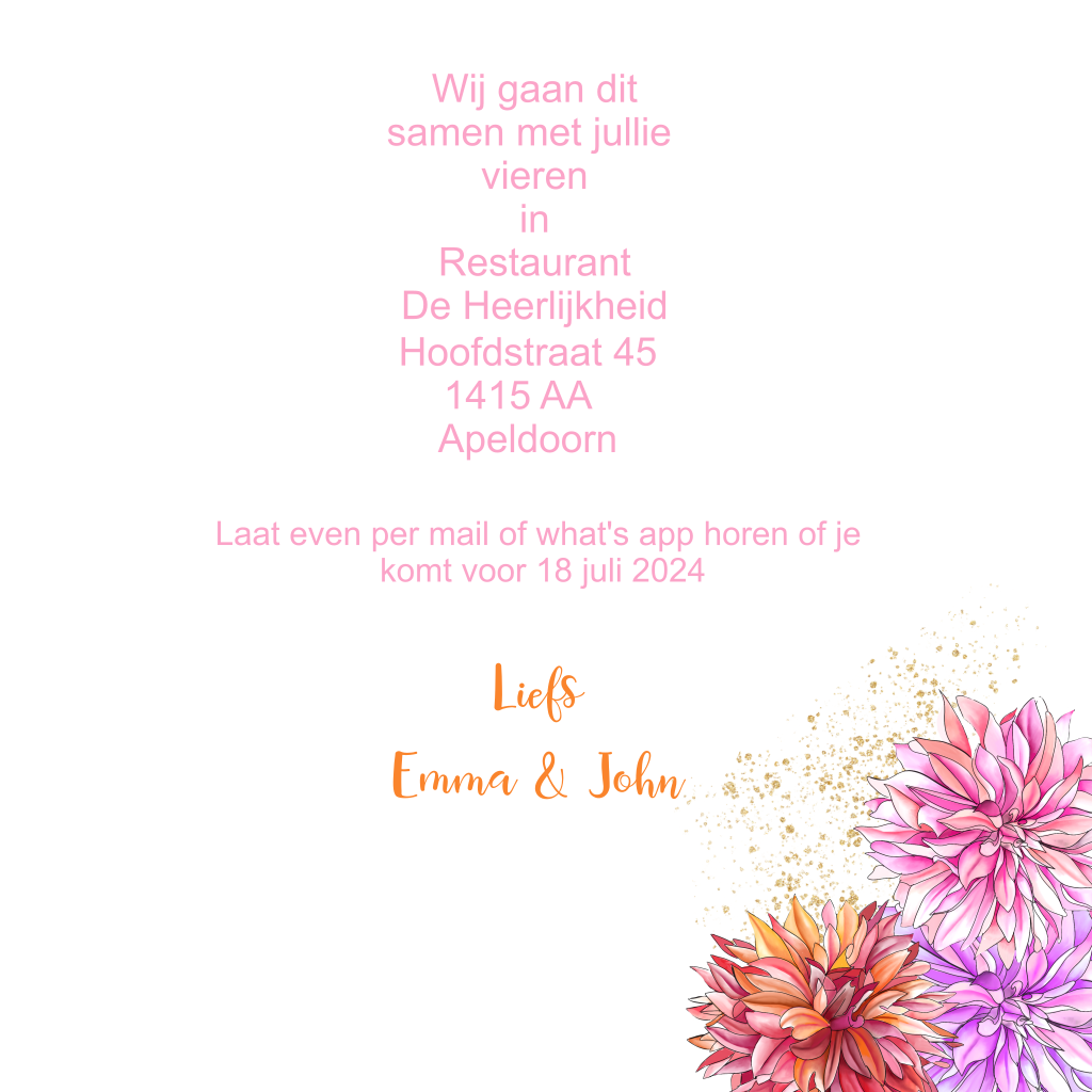 Stijlvolle uitnodiging 40 jaar getrouwd met oranje en paarse dahlia's