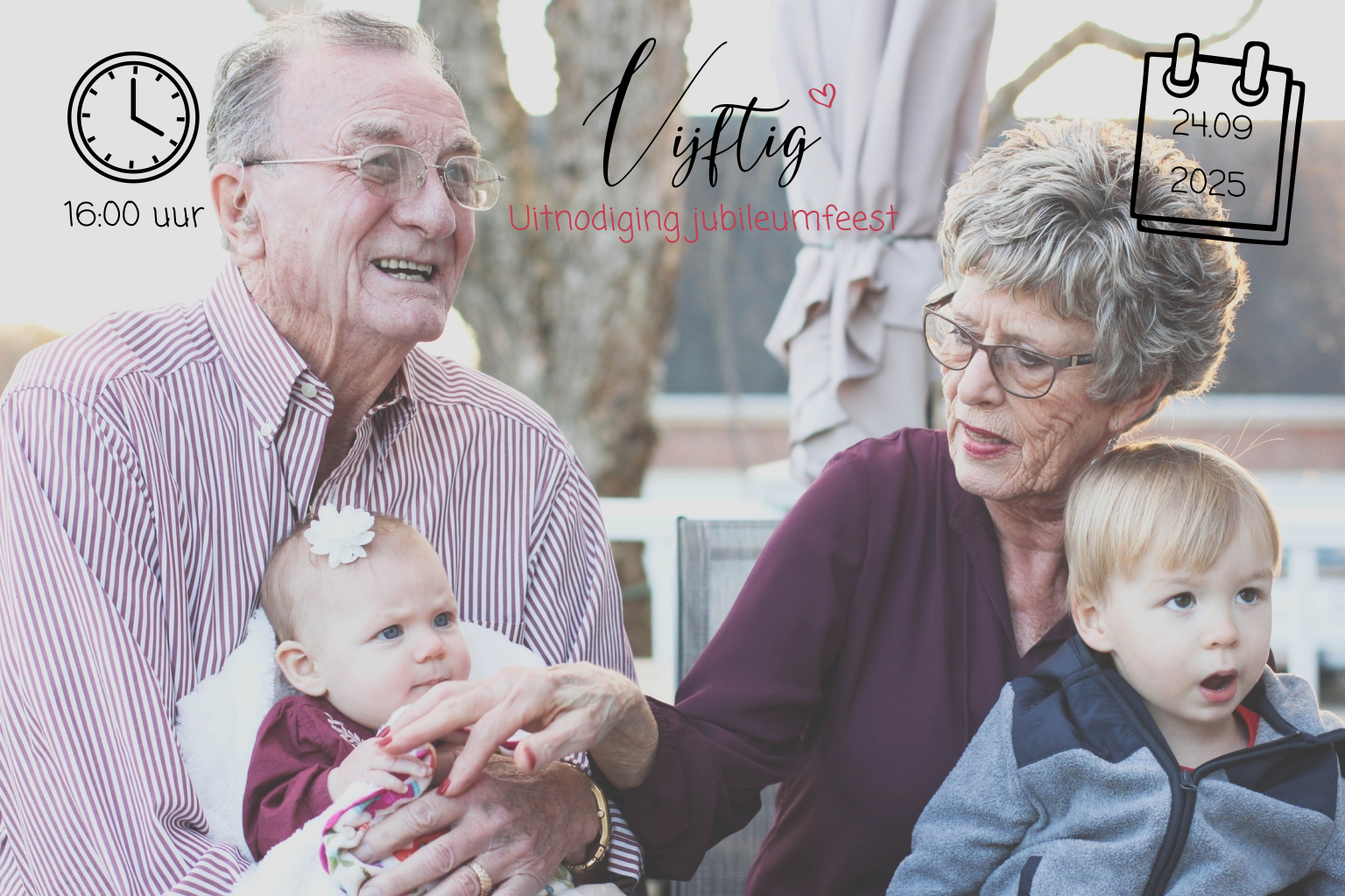 Romantische uitnodiging voor een vijftig jarig jubileumfeest. De kaart heeft leuke details als een getekende kalender, een klokje en een roze hartje op de voorkant. Hierachter plaats je eenvoudig een mooie foto van jullie samen voor een extra persoonlijke touch. Toch liever een ander lettertype, dan pas je dit eenvoudig aan in de online editor samen met je persoonlijke tekst.