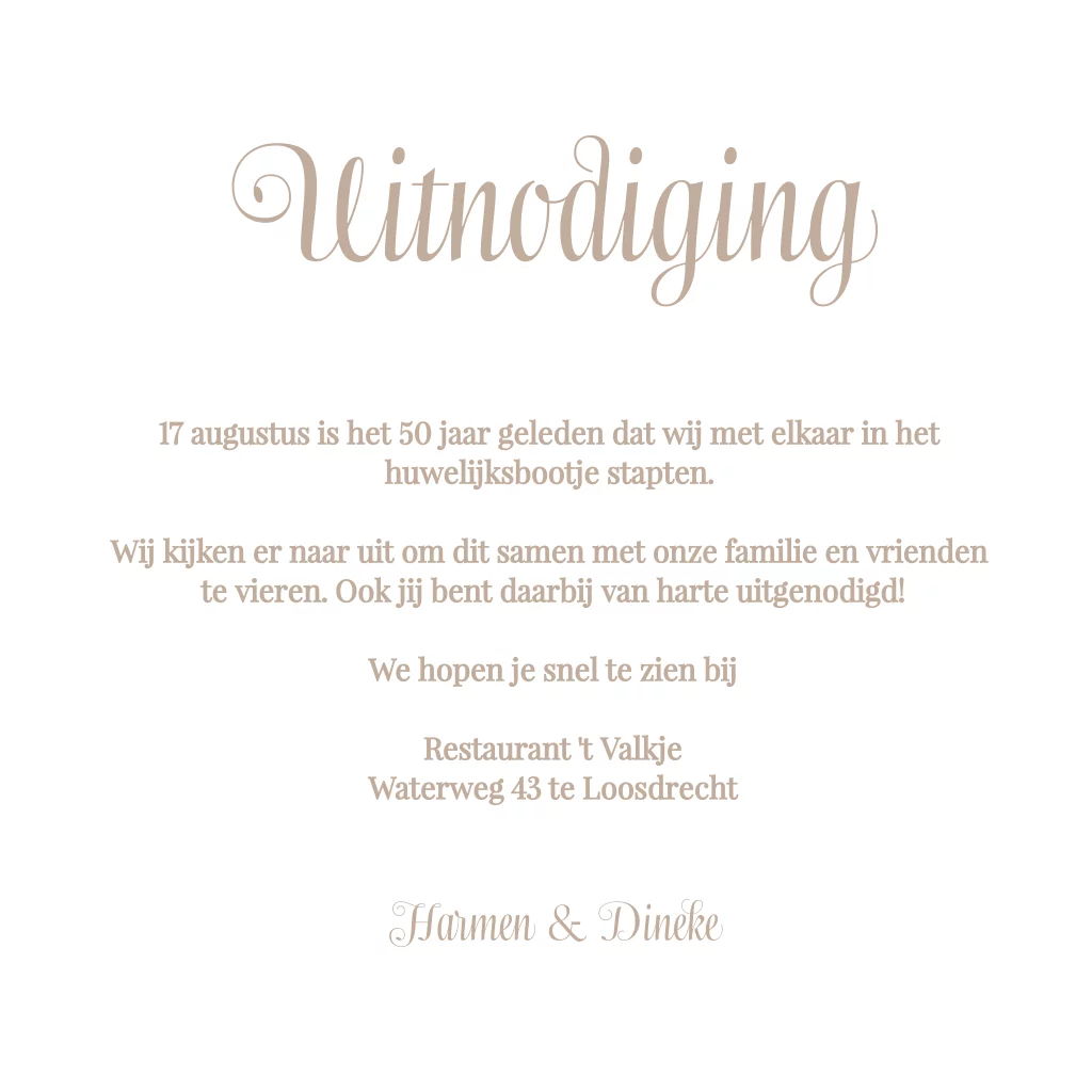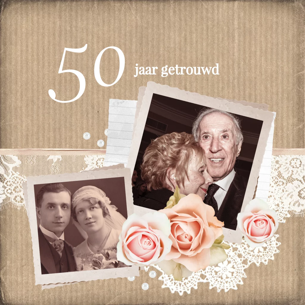 Romantische uitnodiging 50 jarig huwelijk met foto's, rozen en kant