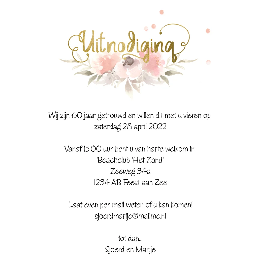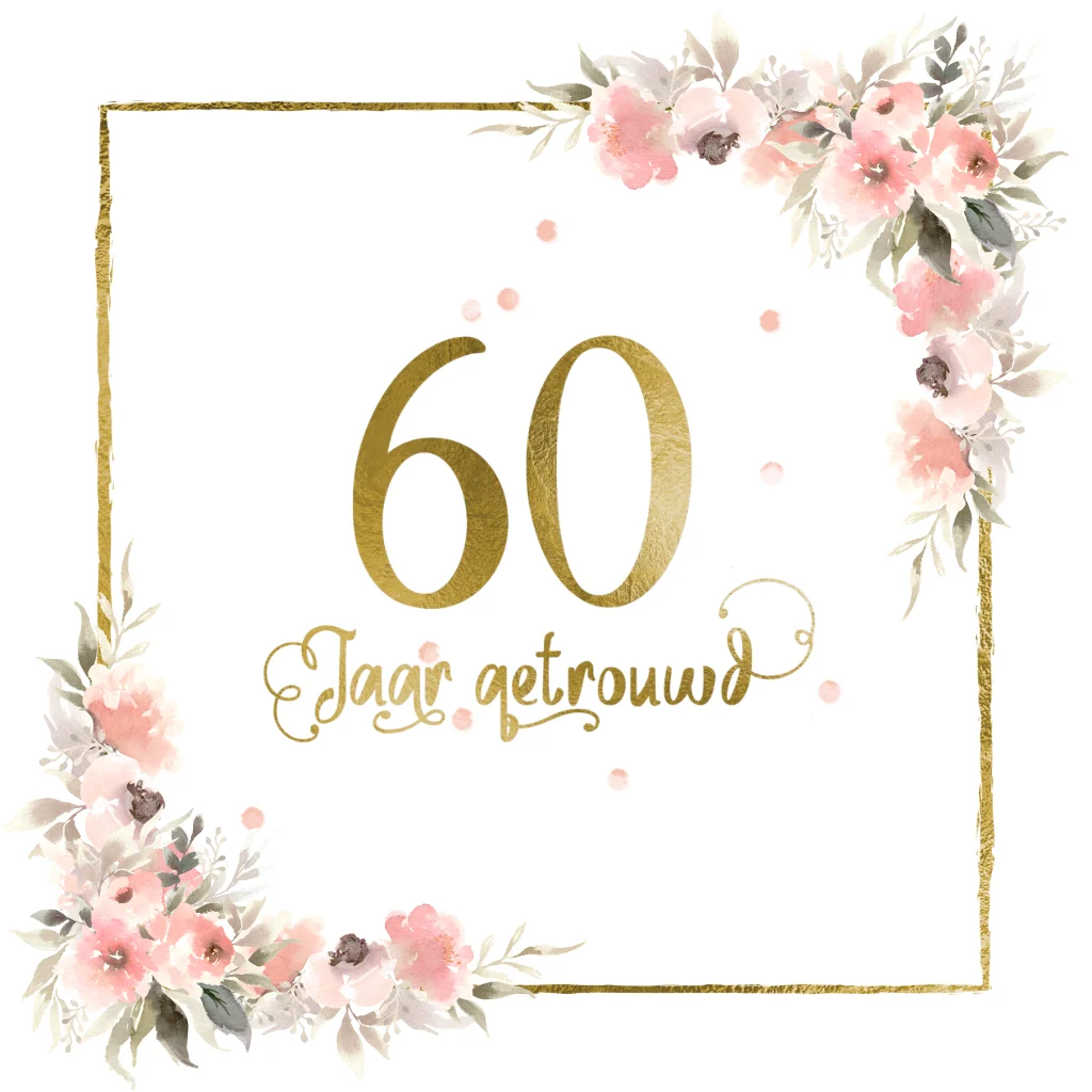 Een klassieke uitnodiging voor jullie 60-jarige jubileum. Op de witte achtergrond is een gouden kader te zien met stijlvolle roze bloemen. In het midden staat het aantal jaar dat jullie getrouwd zijn.