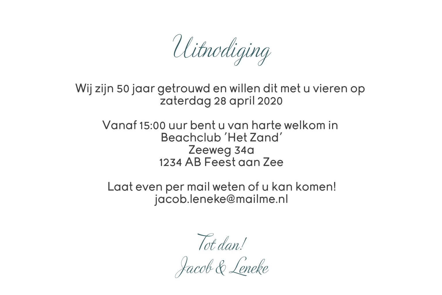 Stijlvolle uitnodiging voor jullie 50 jarig huwelijk met foto's en blauw/grijze vakken waar je tekst in kunt plaatsen. Schrijf een persoonlijke tekst en nodig je geliefden uit voor jullie jubileumfeest!