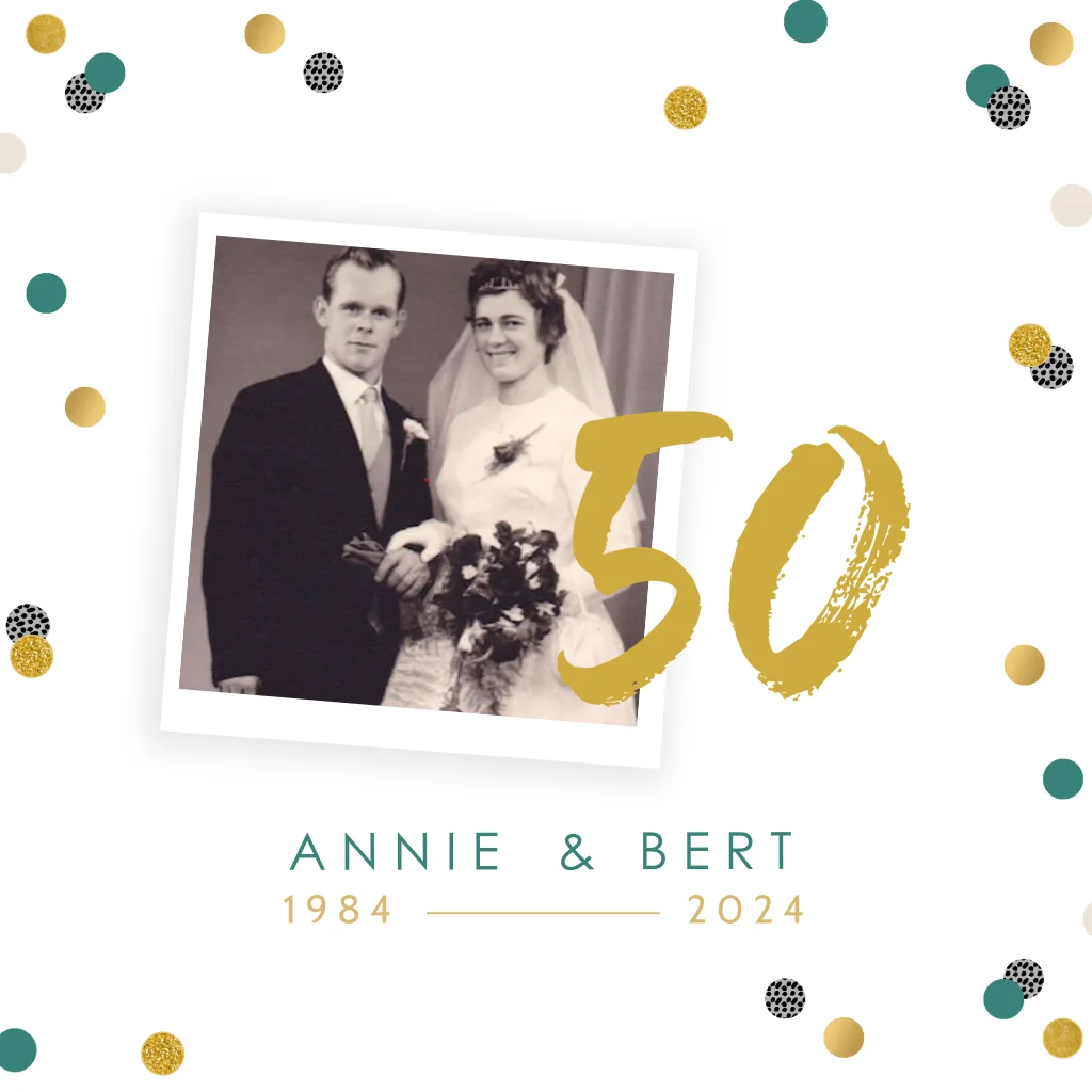 Vrolijke jubileumkaart voor een 50 jarig jubileum met eigen foto en gekleurde confetti in goudkleur, groen en wit. Voeg een eigen foto toe in het polaroid kader en pas de teksten op de kaart eenvoudig aan in de online editor.