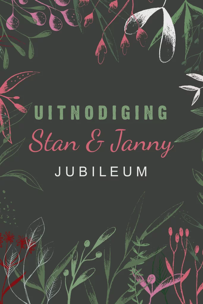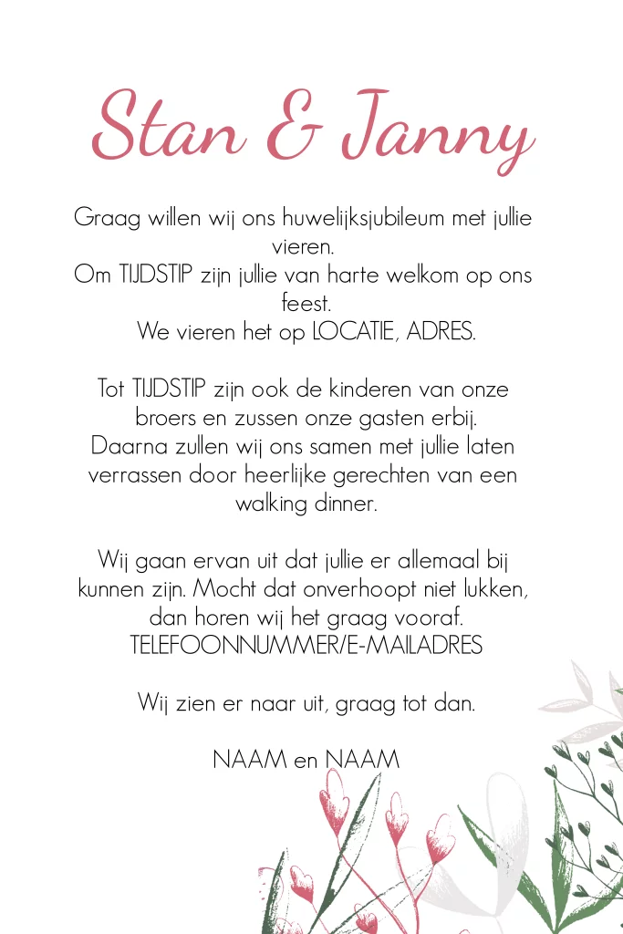 Hoera, jullie zijn x jaar getrouwd! Deze dubbele, staande jubileumkaart is versierd met vrolijke, getekende takjes in de kleuren groen, roze, rood en wit. Aan de binnenkant van de kaart komen deze op een subtiele manier weer terug.