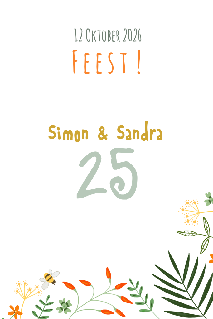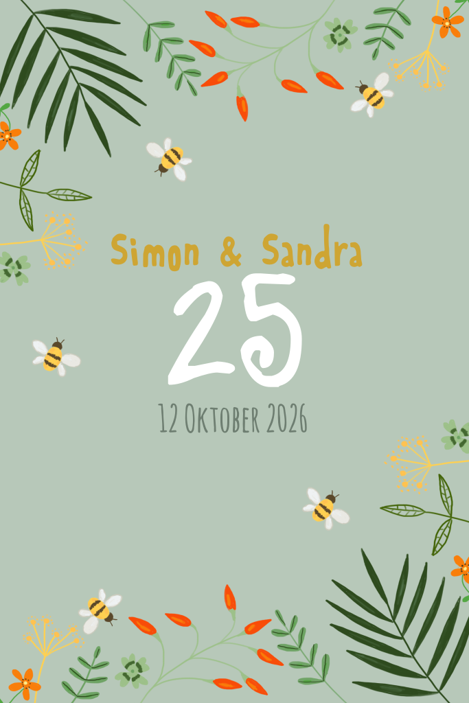 Een vrolijke jubileumkaart voor een 25 jaar huwelijksfeest met bloemen en bijen. De tekst en de gekleurde achtergrond kunnen naar wens in de editor aangepast worden.