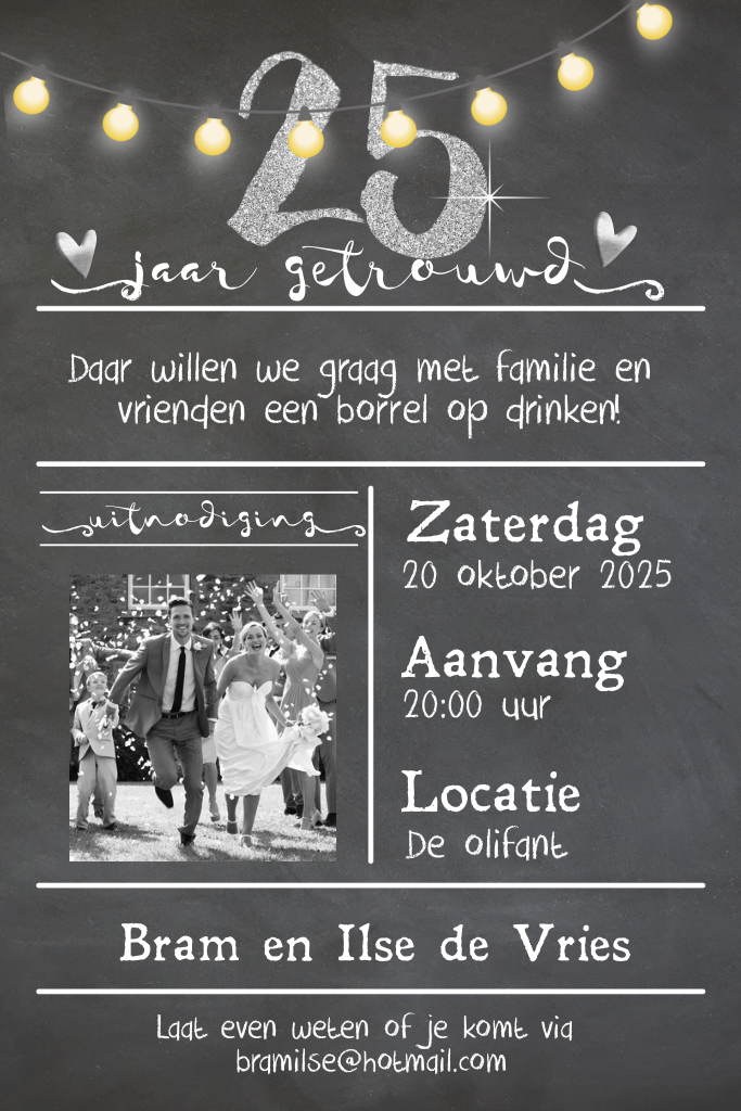 Vieren jullie dat je 25 jaar getrouwd bent? Deze stoere uitnodiging heeft feestverlichting, een foto van jullie trouwdag en leuke teksten op krijtbord achtergrond. Pas de teksten op deze jubileumkaart aan en voeg je eigen foto toe.