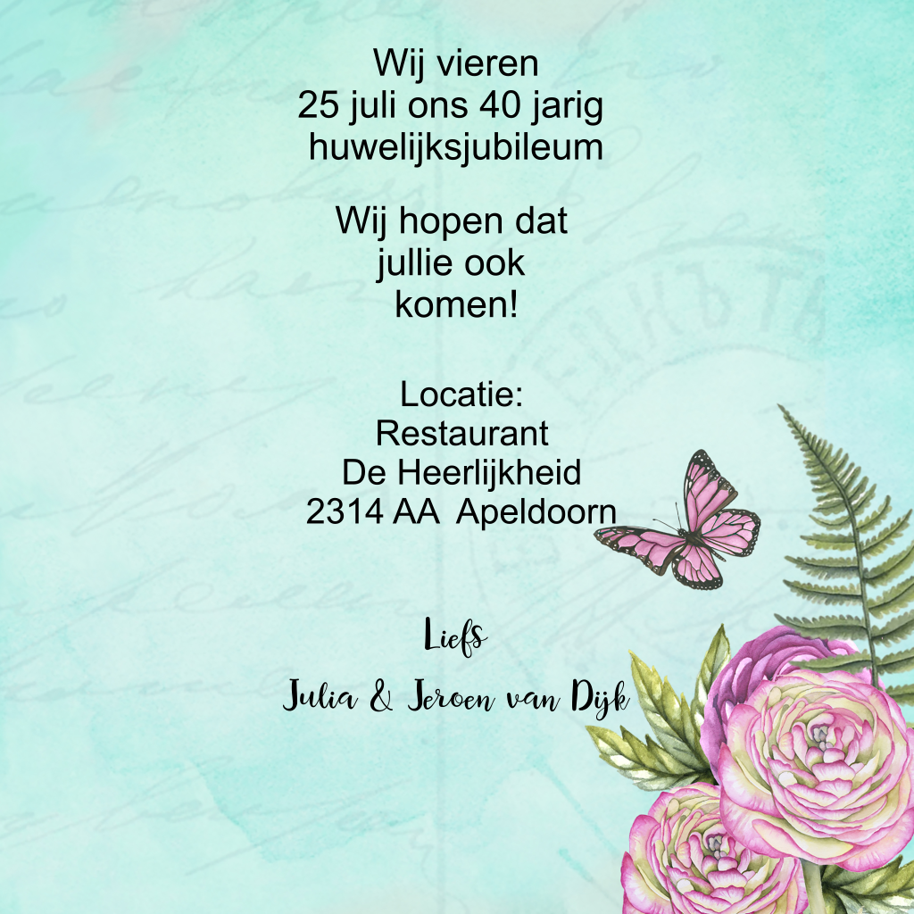 Een stijlvol en kleurrijk jubileumskaartje in blauwgroen met paarse ranonkelbloemen en een hart in het midden waar je tekst op kunt zetten. Maak dit unieke kaartje zelf compleet met teksten in de lettertypes die jij mooi vindt!
