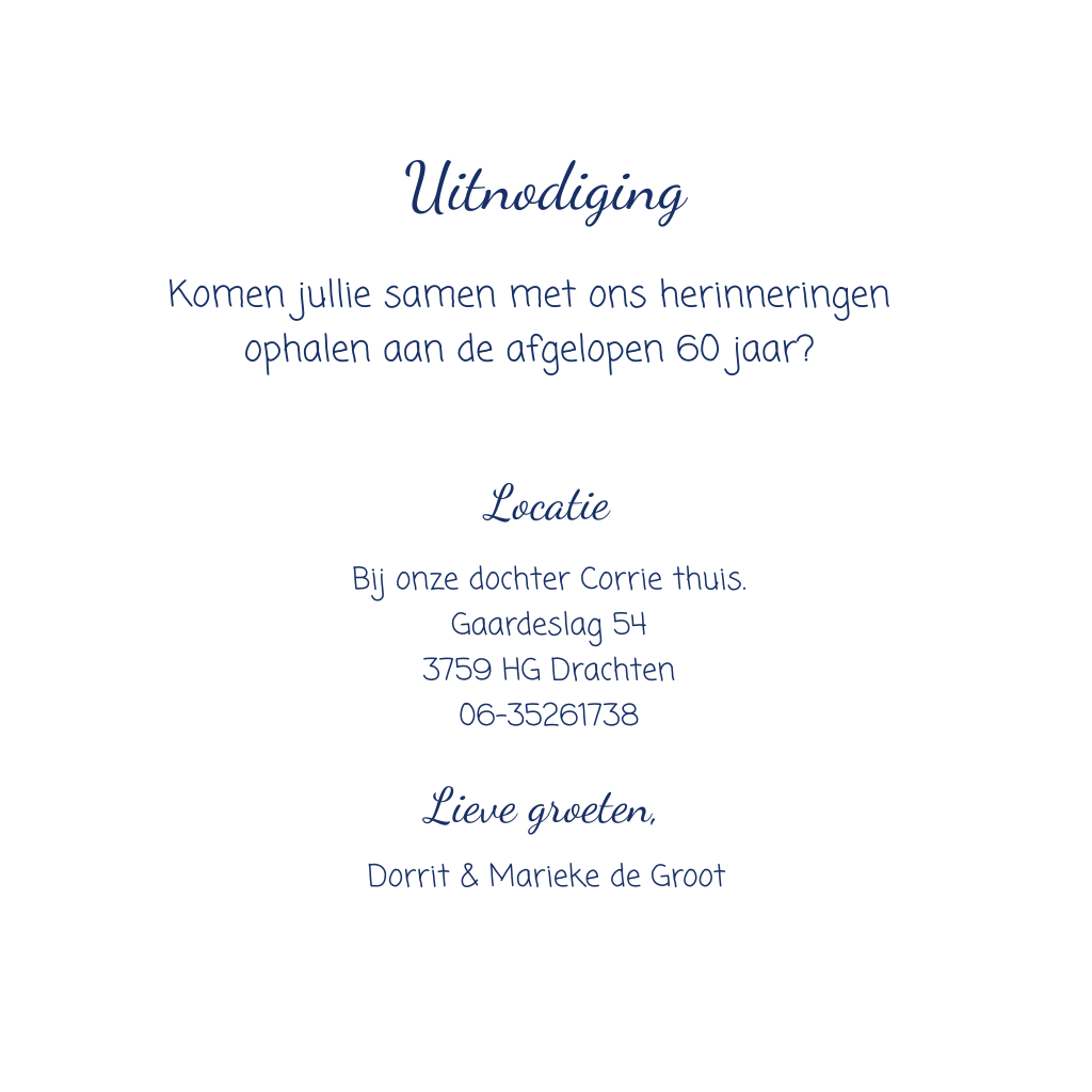 60 jaar getrouwd, gefeliciteerd! Nodig vrienden en familie uit met deze stijlvolle jubileumkaart met donkerblauwe takjes en cirkel. De houtachtergrond geeft hem een unieke uitstraling.