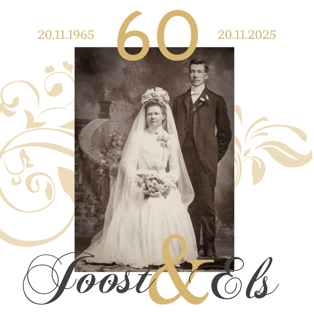 Klassieke uitnodigingskaart voor 60 jarig huwelijksjubileum met foto en barok krullen op wit.