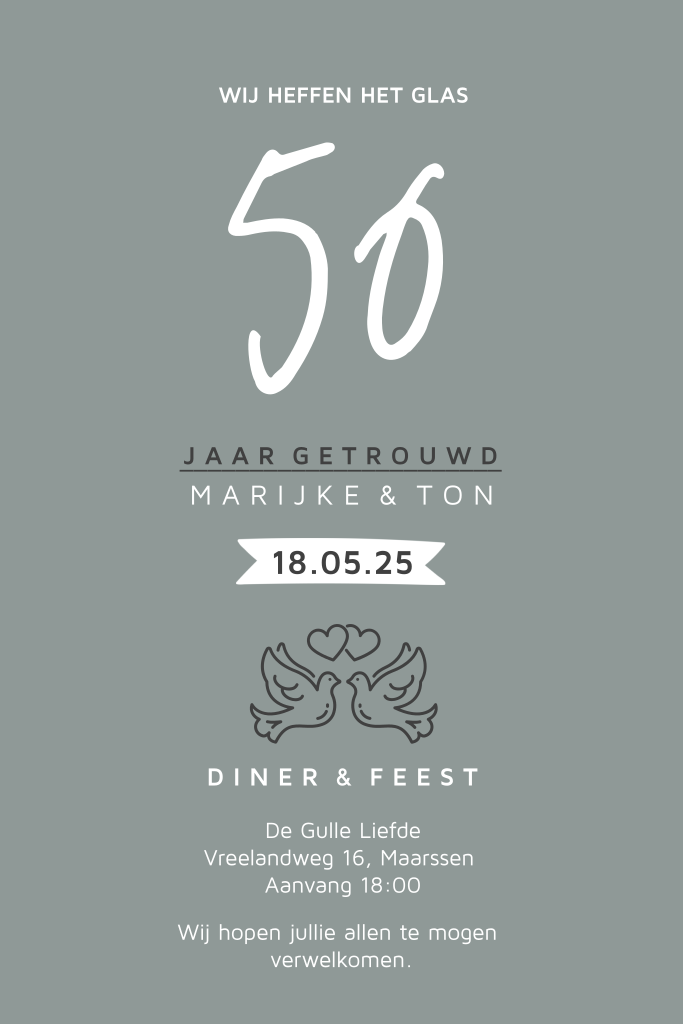 Hippe minimalistische uitnodigingskaart voor jullie 50 jarig jubileum. Met mooie typografie en illustratie van duiven op een blauw grijze achtergrond. Pas de teksten op de kaart aan en maak zo je eigen unieke ontwerp.