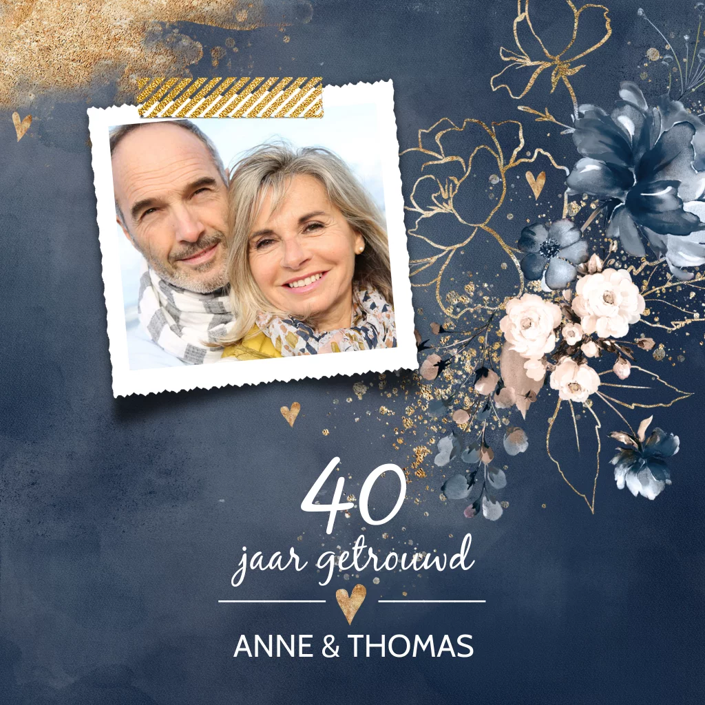 Stijlvolle jubileumkaart voor 40 jaar getrouwd. Plaats een foto van jullie op de voorkant tussen de sierlijke bloemen.