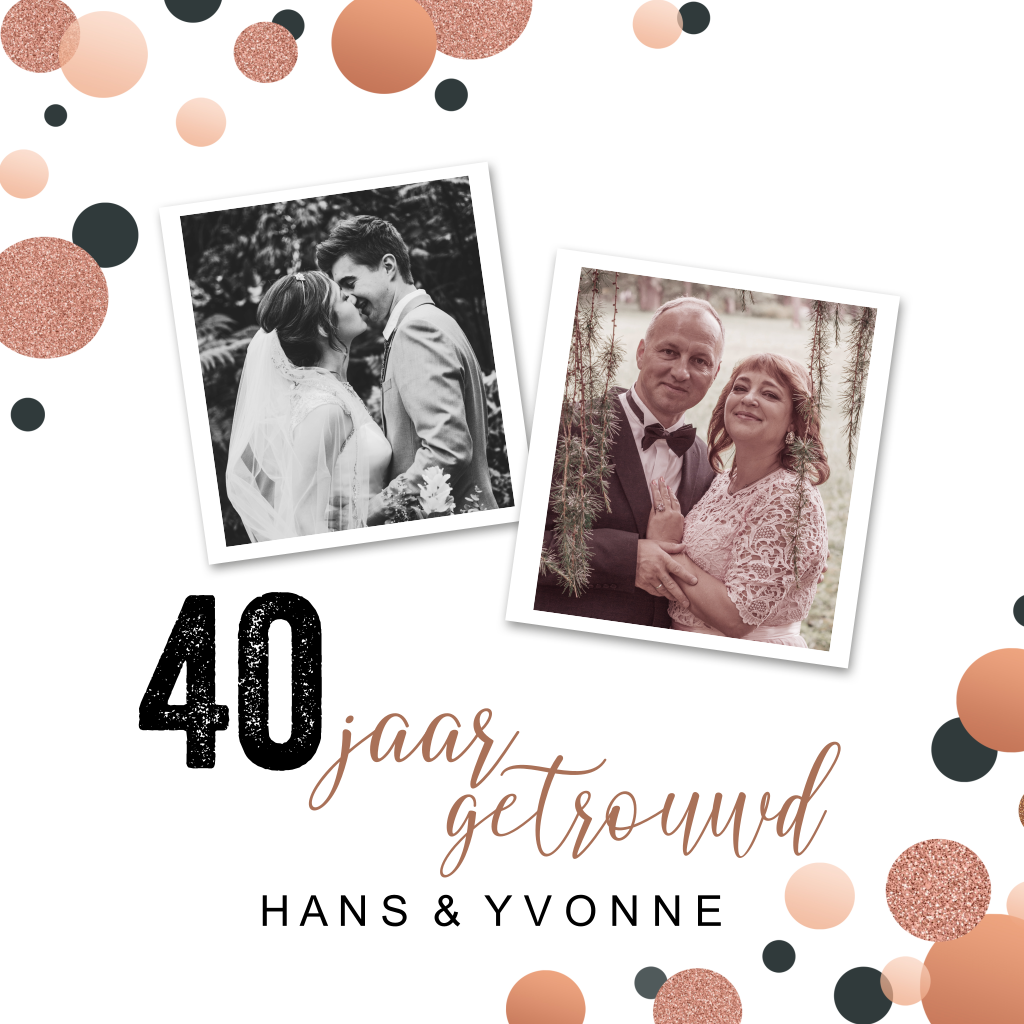 Stijlvolle, trendy kaart voor 40 jarig jubileum met foto's in een wit kader en koperkleurige confetti op een witte achtergrond.