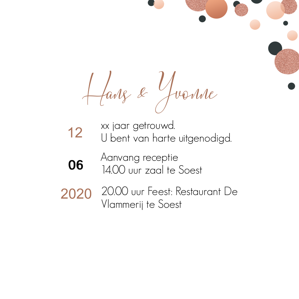 Stijlvolle jubileumkaart met koperkleurige confetti en foto's