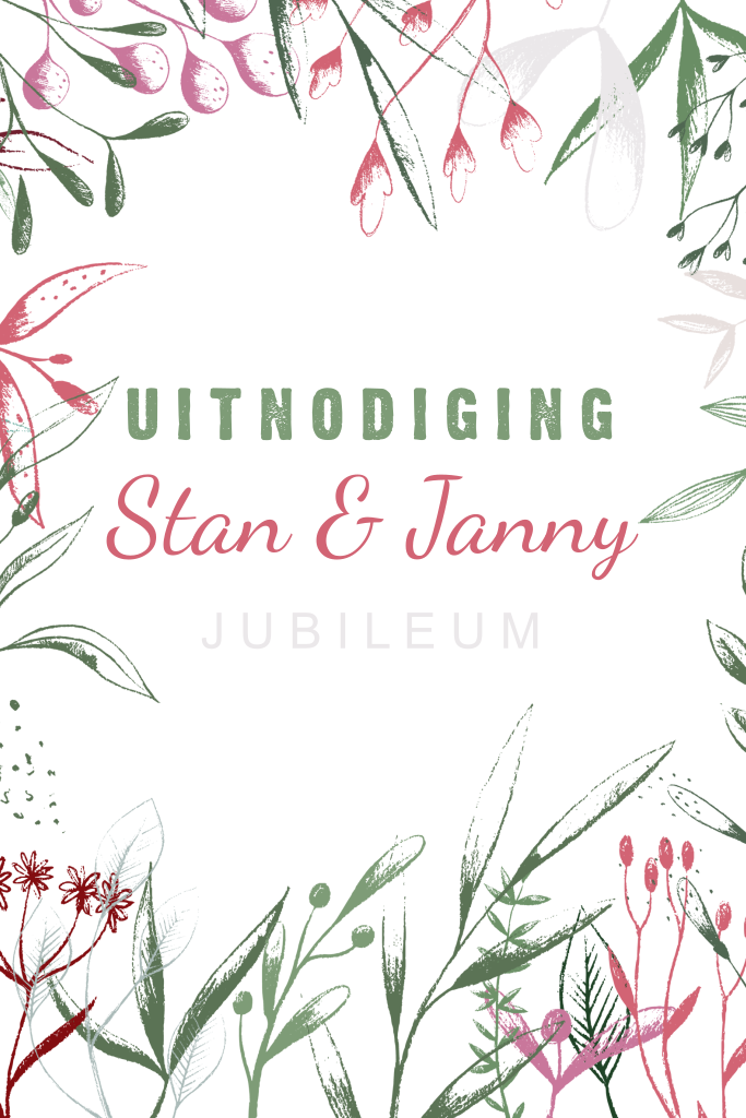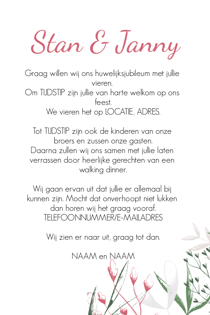 Wat een stijlvol jubileumkaartje! Mooi is de rand van allemaal verschillende, getekende takjes in paars en groen. De kleuren van de tekst matchen hier helemaal bij. Schrijf je eigen tekst aan de binnenkant en maak hem compleet met een bijpassende envelop!