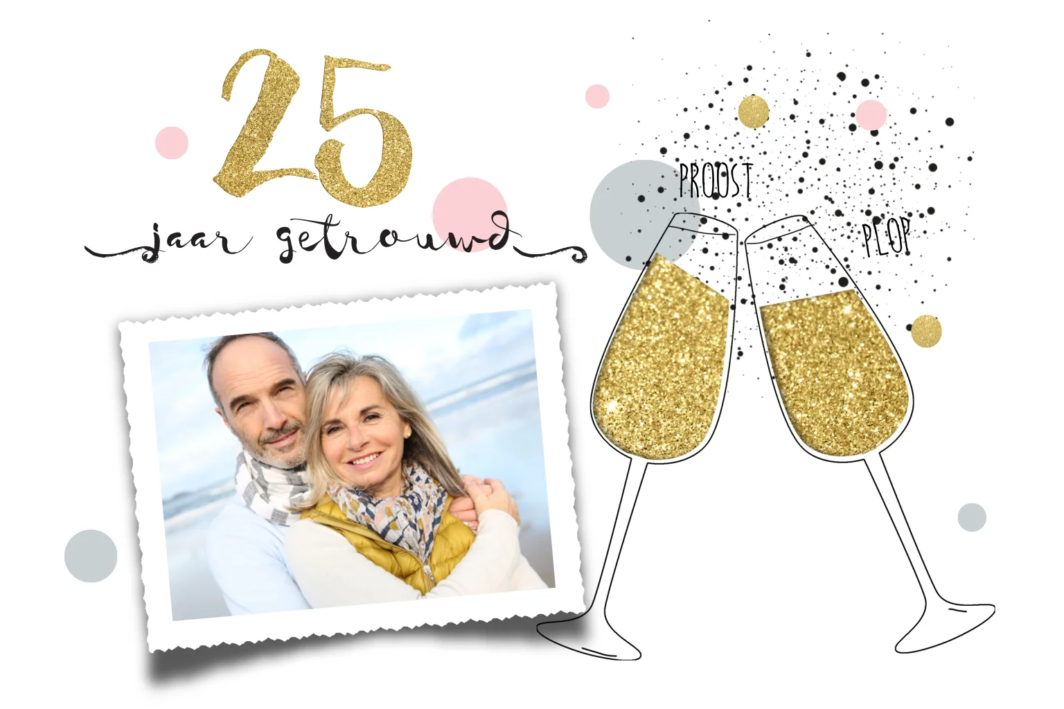 Vrolijke jubileumkaart 25 jaar met glazen champagne en confetti