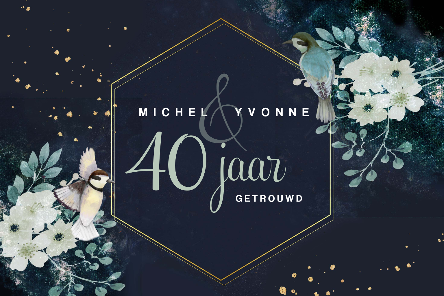 Mooie jubileumkaart met bloemen en vogeltje voor stellen die 40 jaar getrouwd zijn.
