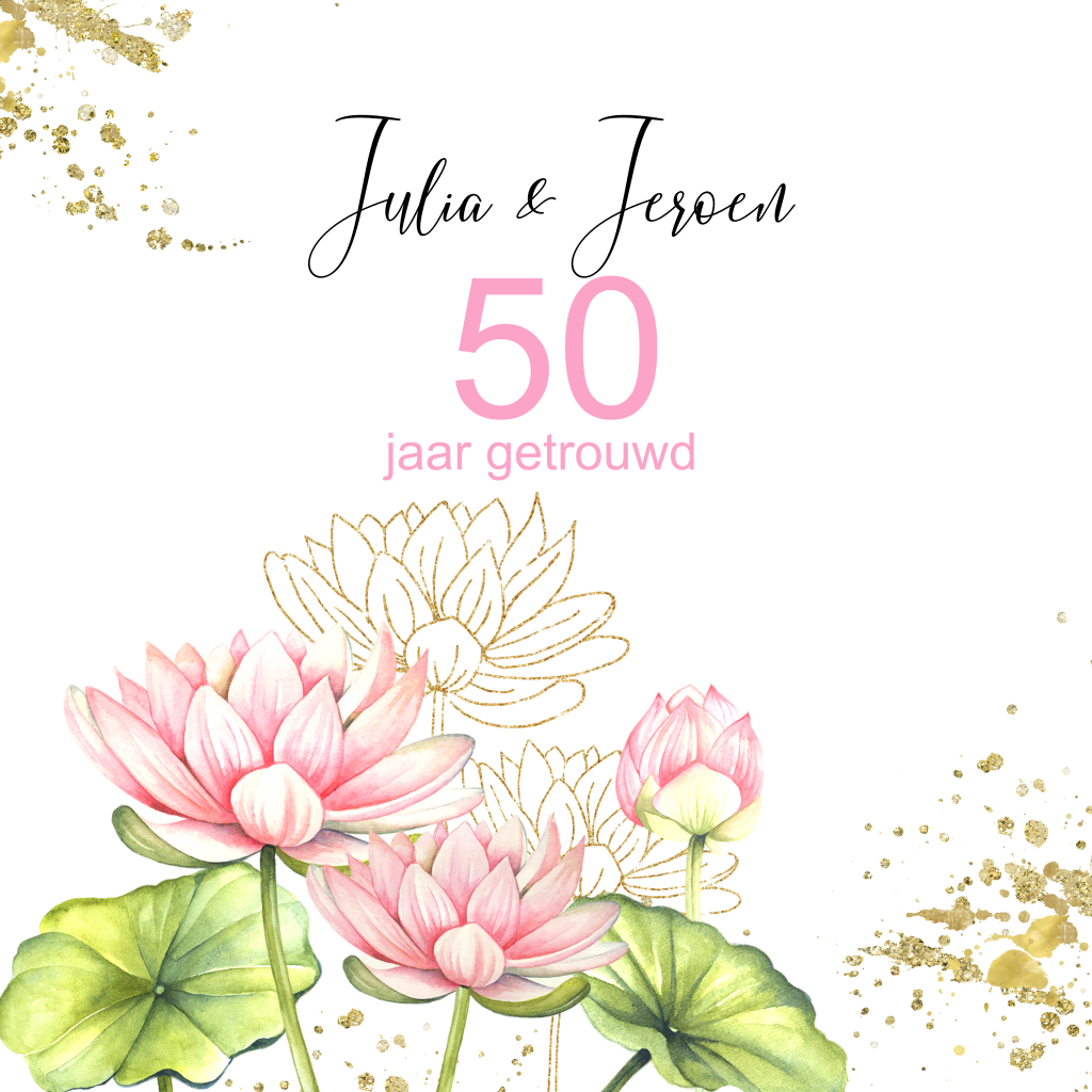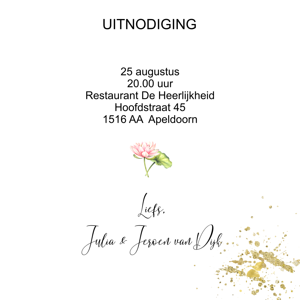 Een stijlvolle en romantische uitnodiging voor een huwelijksjubileum! Versierd met prachtige lotusbloemen en feestelijke verfspatters in goudlook. Wanneer vieren jullie feest?