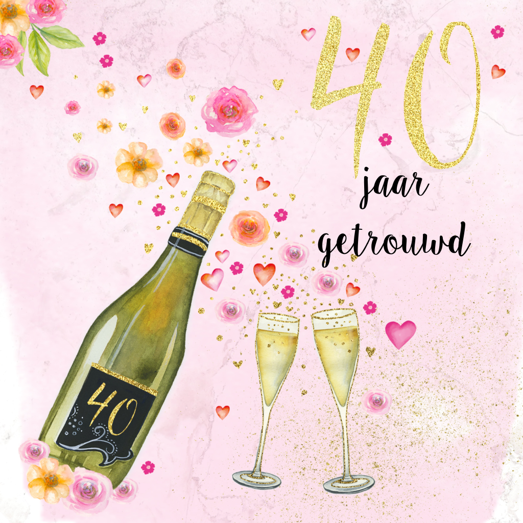 Jubileumkaart 40 jaar met champagne fles, bloemen en hartjes