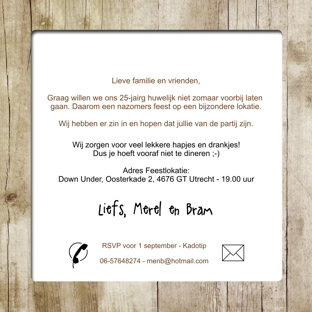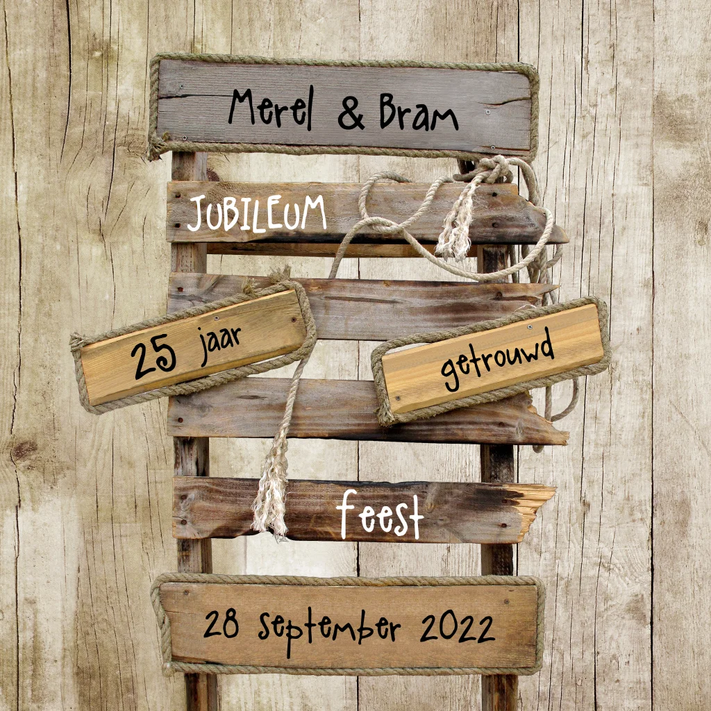 Hippe uitnodiging met houtpatroon en pallet wegwijzer van sloophout. Alle teksten kun je veranderen en binnen je foto plaatsen.
