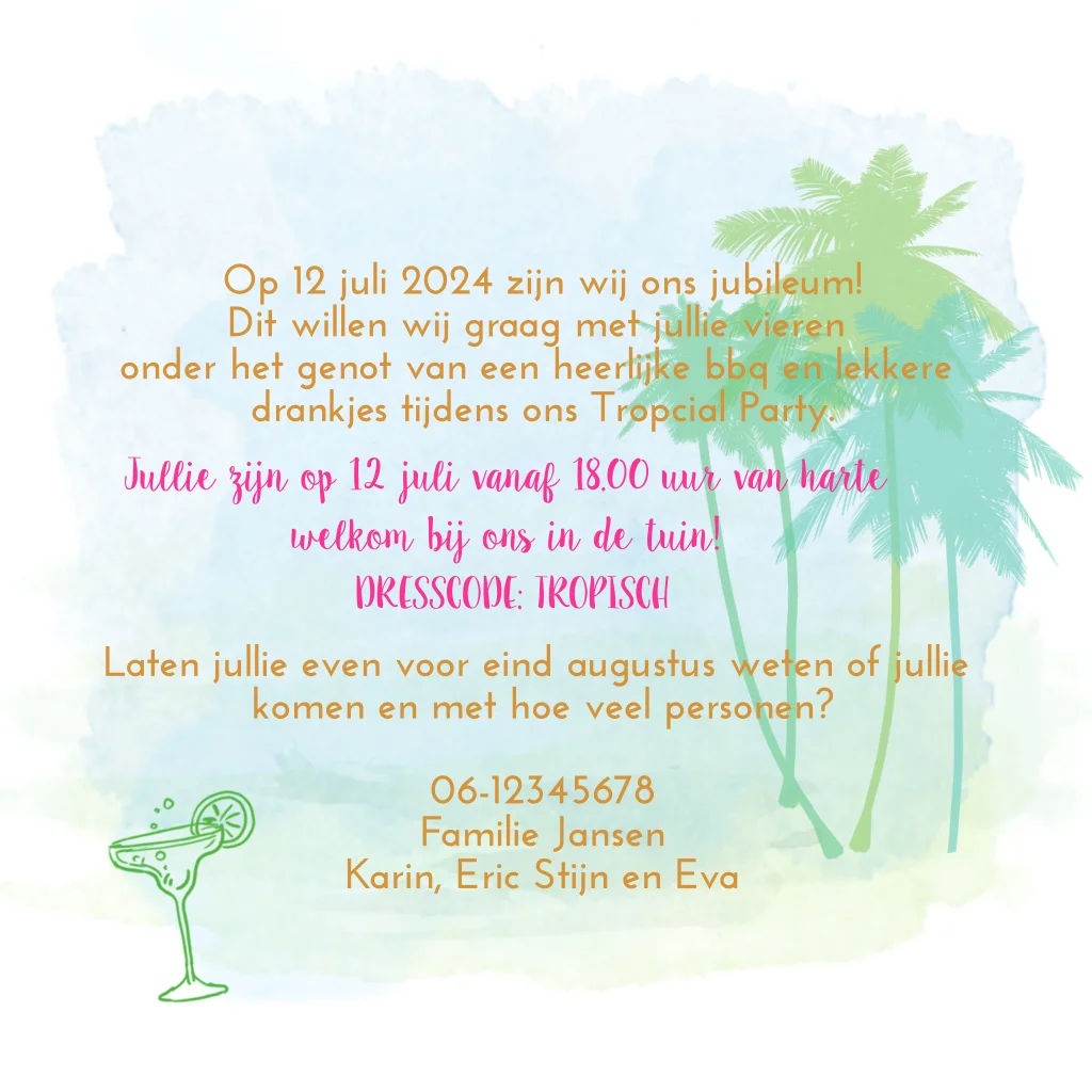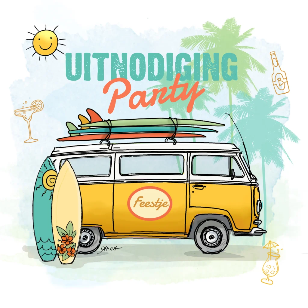 Vrolijke uitnodiging jubileumfeest met volkswagenbusje en surfplank