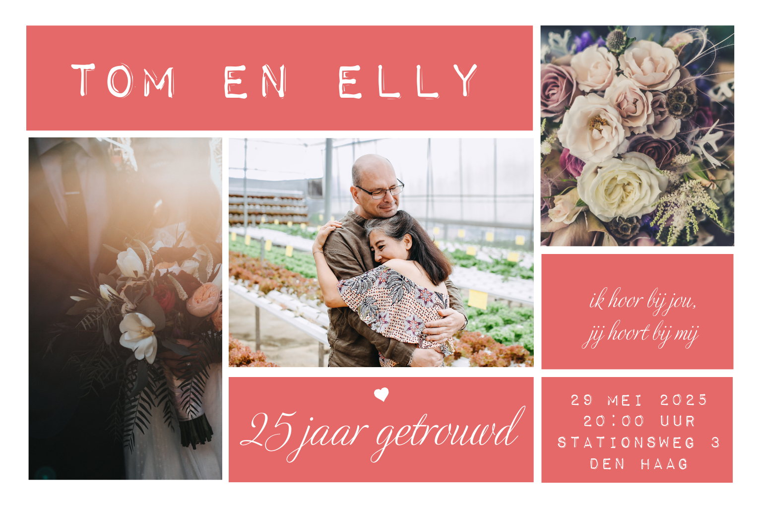 Pas deze jubileumkaart aan naar je eigen smaak en maak zelf een unieke uitnodiging voor jullie 25 jarig huwelijksfeest. Voeg foto's toe en schrijf een eigen tekst om deze kaart af te maken.