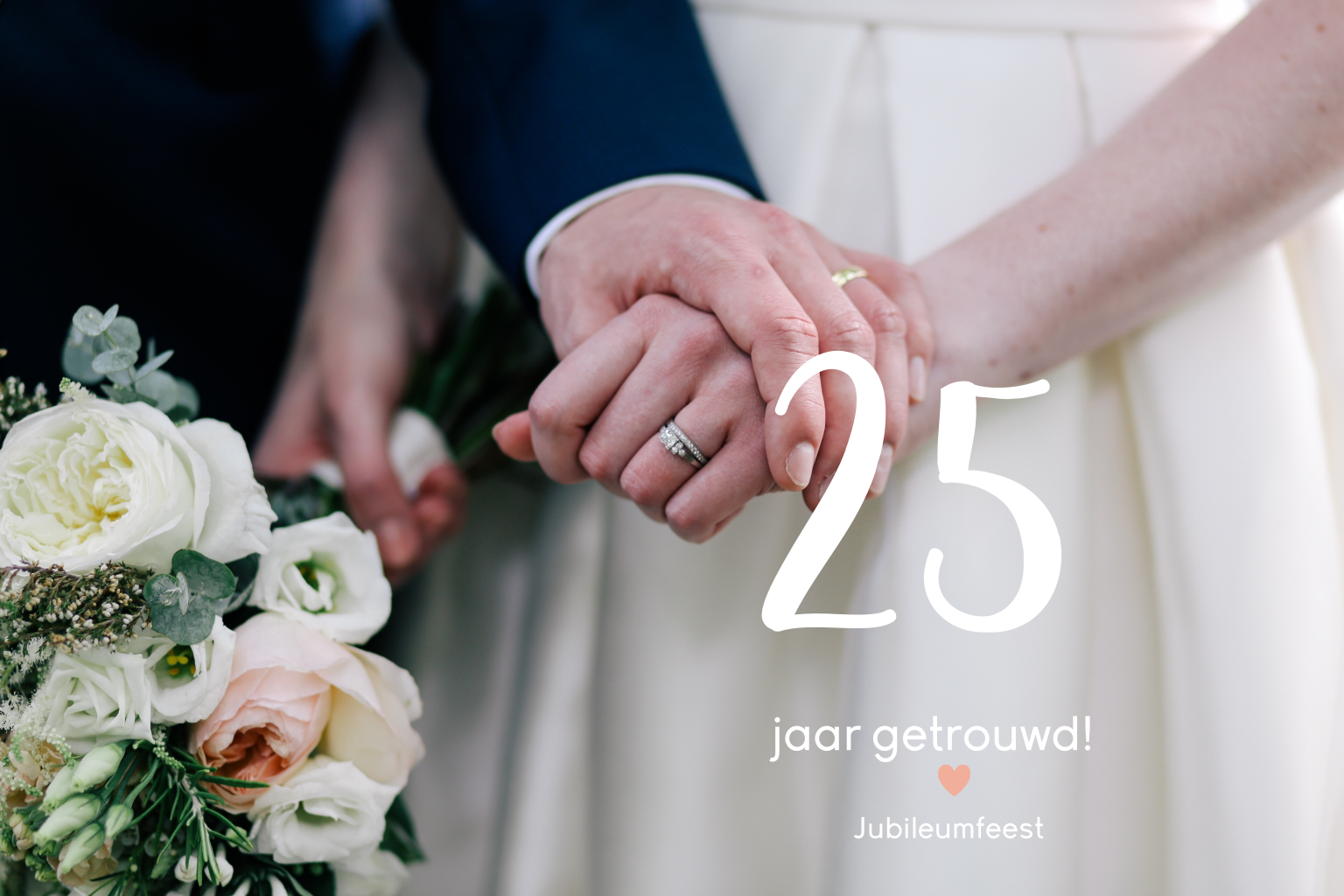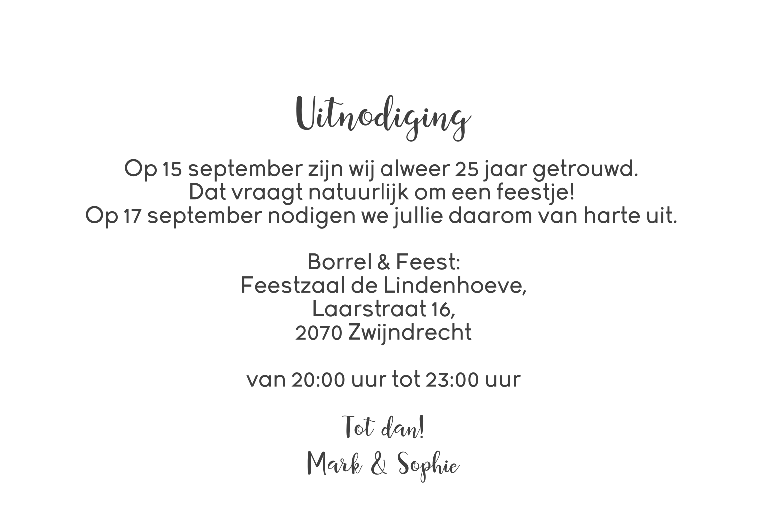 Maak een mooie romantische uitnodiging voor jullie 25-arig huwelijk. Pas deze jubileumkaart aan naar wens en maak een unieke kaart. De hele kaart is eenvoudig aan te passen, dus hij is voor elk huwelijk jubileum te gebruiken!